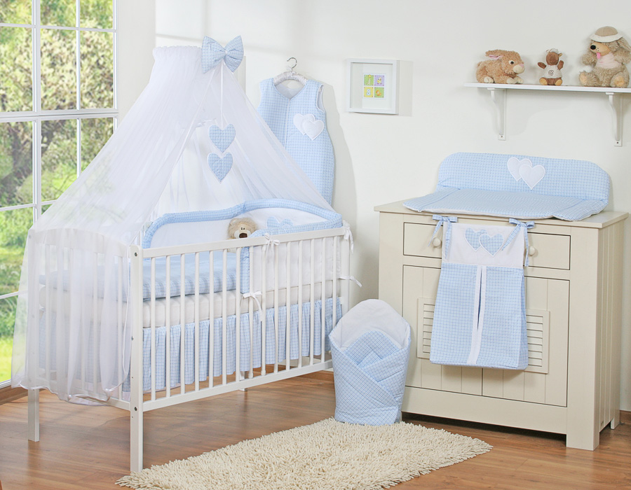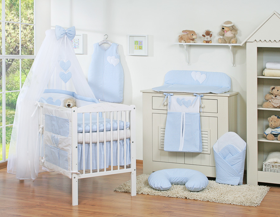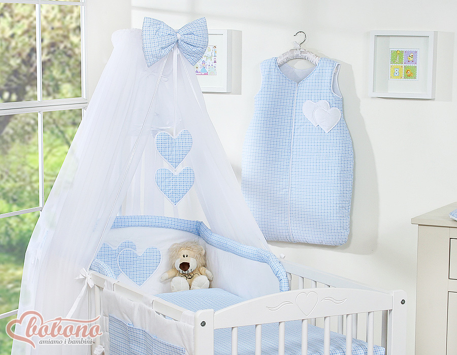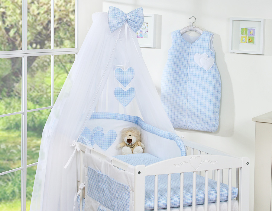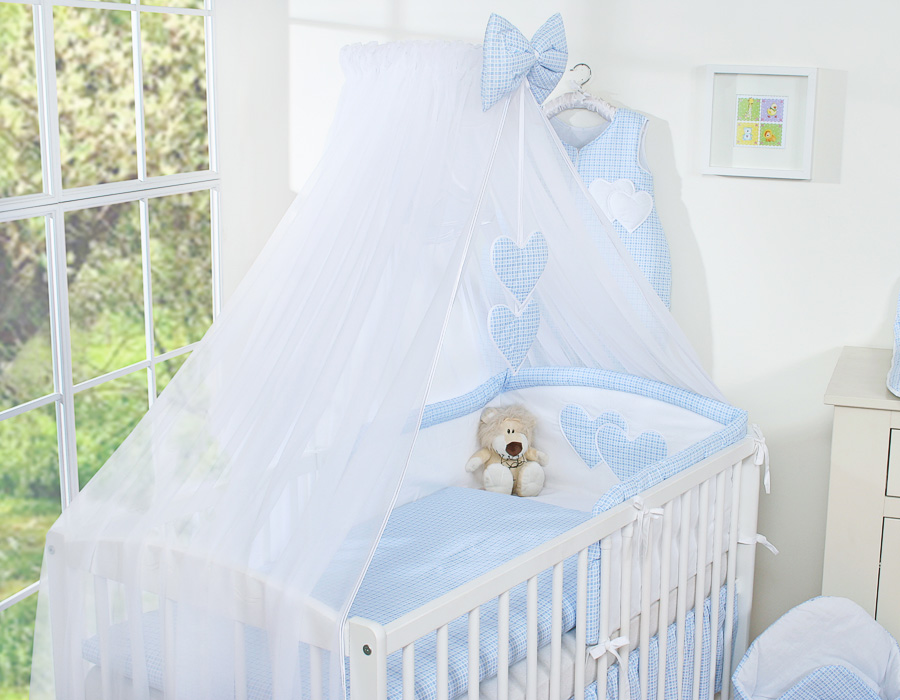 Bébé chambre » Linge de lit bébé » Linge de lit bébé Cœurs » Linge de lit bébé 120cm Cœurs » Ensemble de linge de lit 7 pcs avec moustiquaire » 7pcs Ensemble Lit Bébé Ciel Tour de Lit Bleu à Carreaux Cœurs