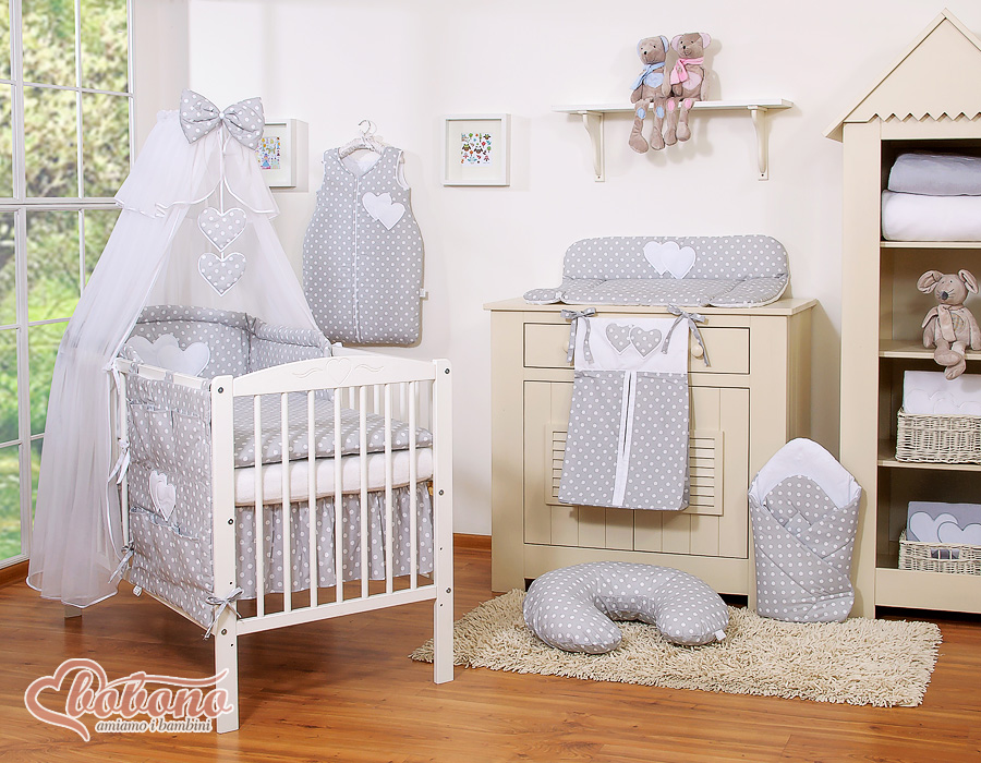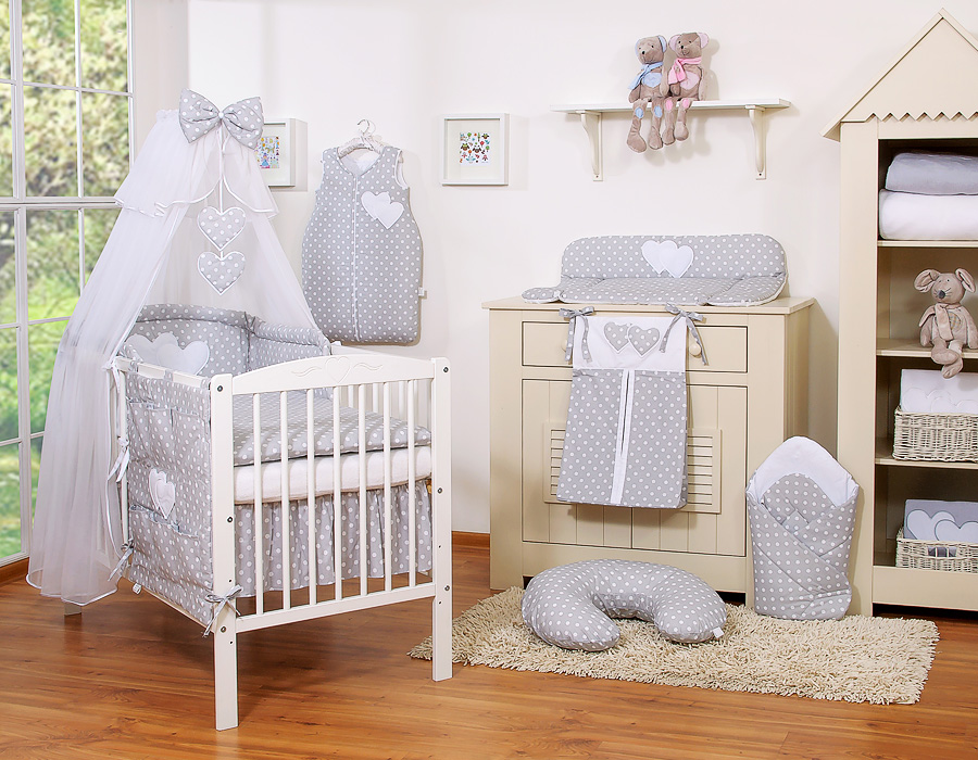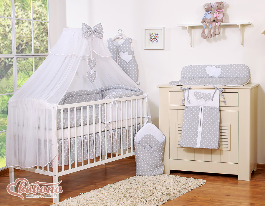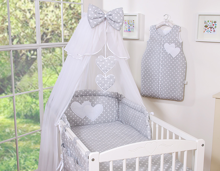 Bébé chambre » Linge de lit bébé » Linge de lit bébé Cœurs » Linge de lit bébé 120cm Cœurs » Ensemble de linge de lit 7 pcs avec moustiquaire » 7pcs Ensemble Lit Bébé Ciel Tour de Lit Gris à Pois Cœurs