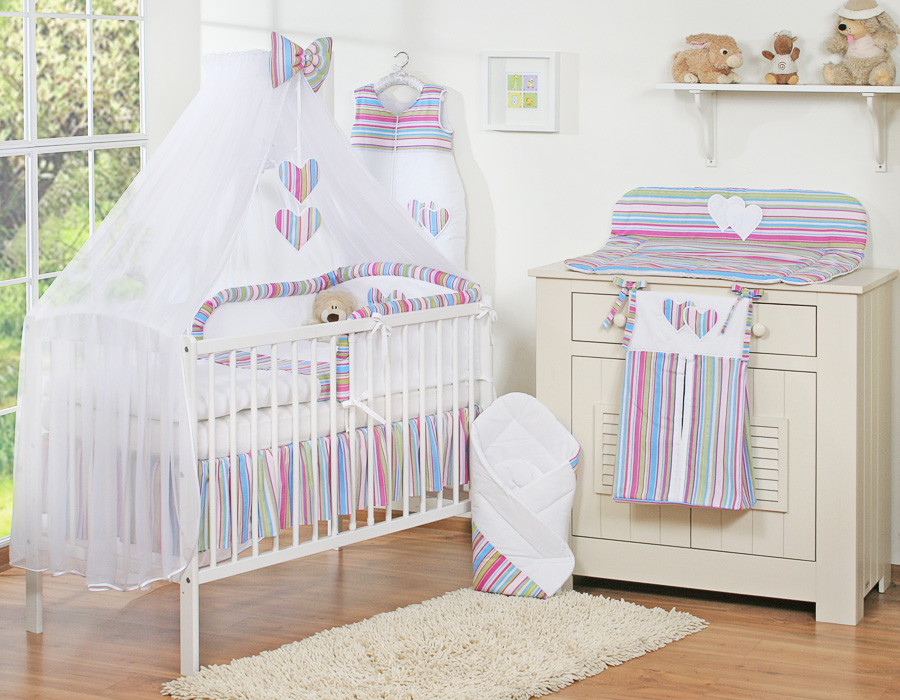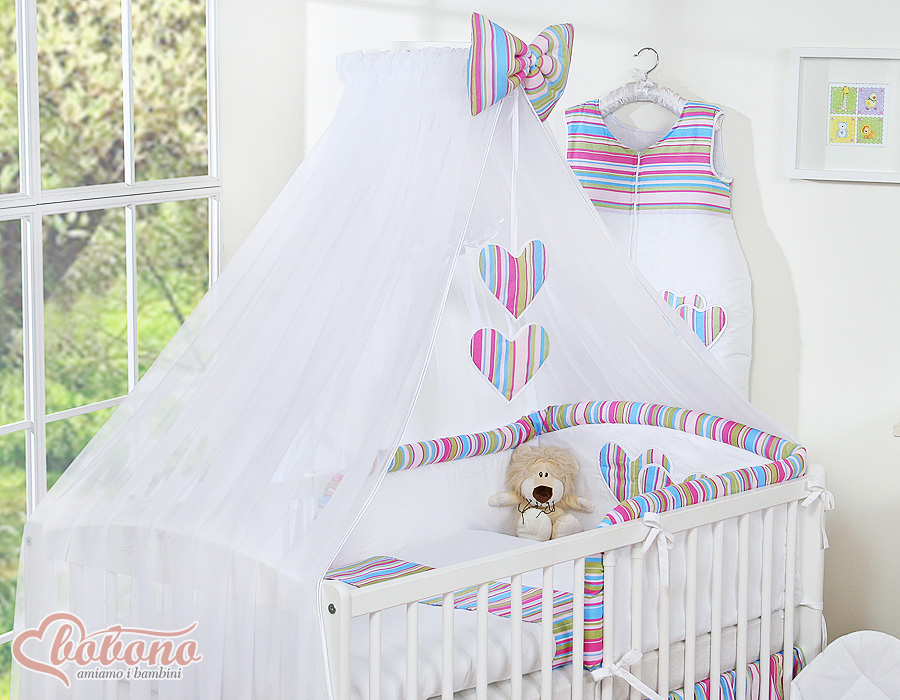 Bébé chambre » Linge de lit bébé » Linge de lit bébé Cœurs » Linge de lit bébé 120cm Cœurs » Ensemble de linge de lit 7 pcs avec moustiquaire » 7pcs Ensemble Lit Bébé Ciel Tour de Lit Lila Rayures Cœurs