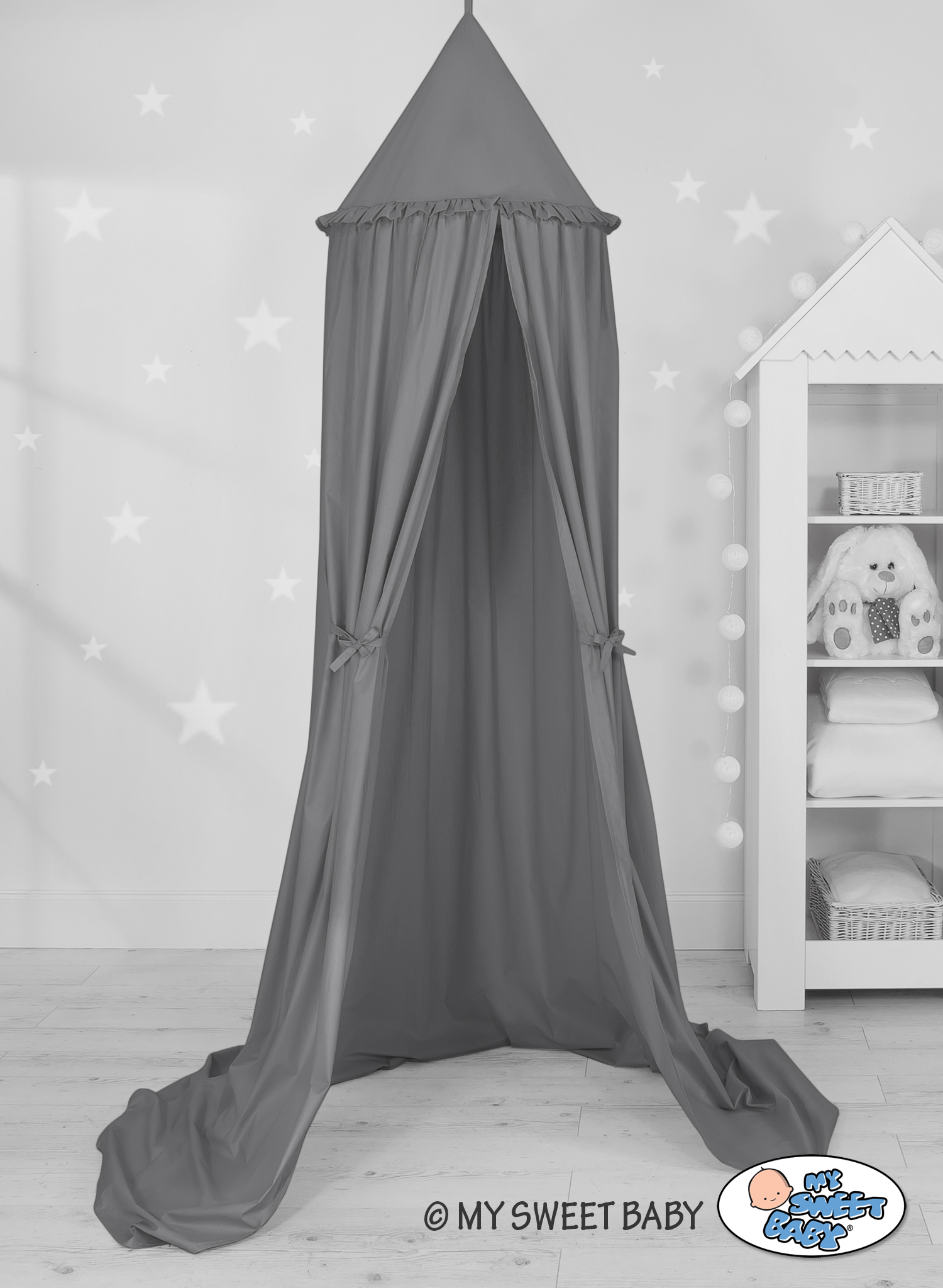 Un long baldaquin suspendu efficace. Un bel élément dans la chambre des enfants. Il peut être utilisé comme décoration unique d'un lit de bébé, tout comme il peut créer un endroit merveilleux pour jouer. La suspension au-dessus du lit protège contre les excès de lumière et de bruit, créant ainsi un endroit confortable et sûr pour se reposer à l'intérieur du lit. Le baldaquin peut facilement être fixé au plafond. La longueur de 260 cm permet de disposer les extrémités sur le sol. Cela crée une cachette parfaite et une aire de jeu pour les enfants plus âgés. Le baldaquin est fabriqué en tissu 100% coton certifié Okotex. Sur les côtés, il y a des rubans pratiques pour attacher le baldaquin et créer une belle tente. Le bord du haut peut être enlevé. Le tissu est lavable à 30 degrés.