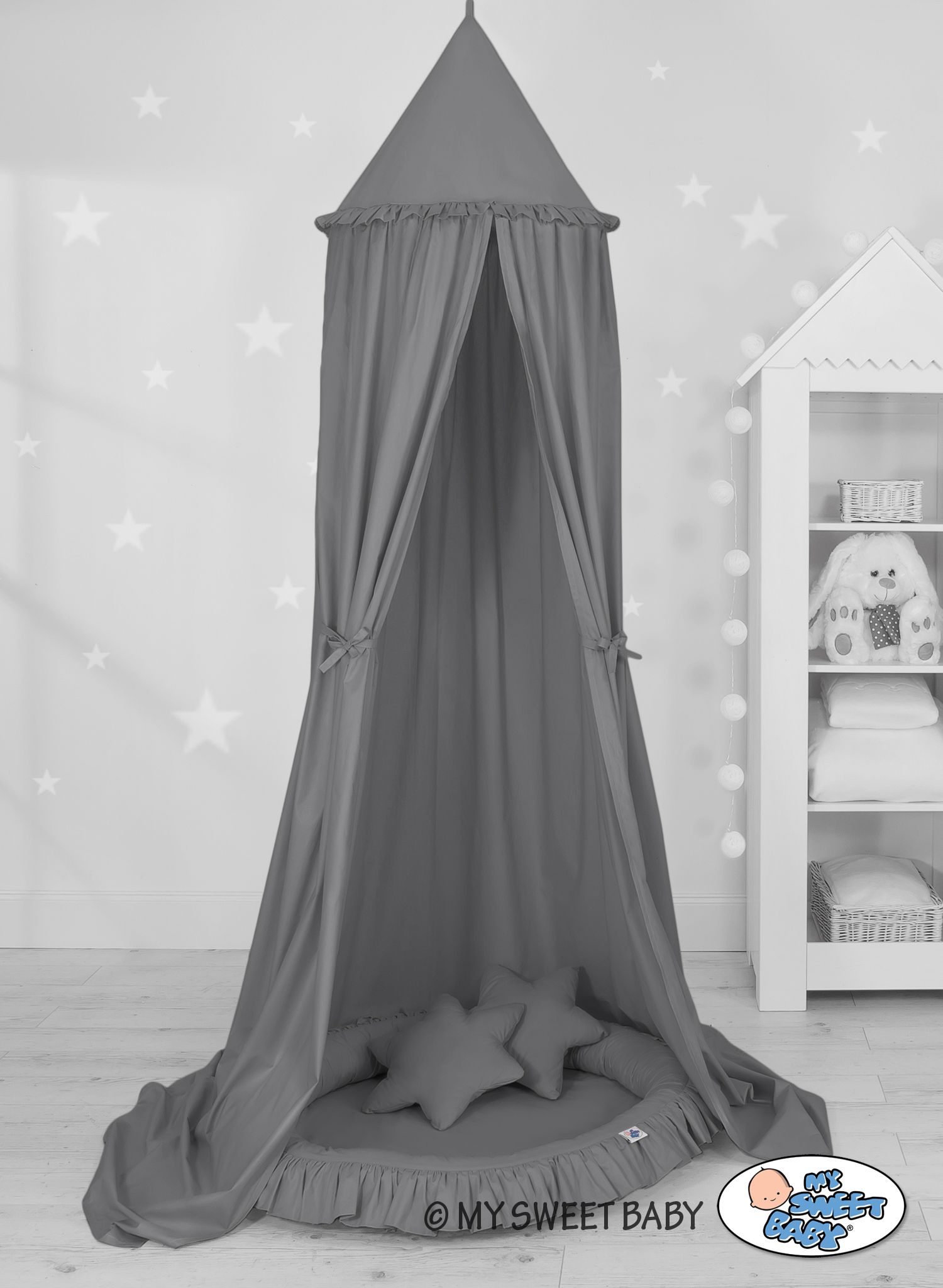 Un long baldaquin suspendu. Un bel élément dans la chambre des enfants. Il peut être utilisé comme décoration unique au-dessus d'un lit de bébé, tout comme il peut créer un endroit merveilleux pour jouer. La suspension au-dessus du lit protège contre les excès de lumière et de bruit, créant ainsi un endroit confortable et sûr pour se reposer à l'intérieur du lit. Le baldaquin peut facilement être fixé au plafond. La longueur de 260 cm permet de disposer les extrémités sur le sol. Cela crée une cachette parfaite et une aire de jeu pour les enfants plus âgés. La capote est fabriquée en tissu 100% coton certifié Okotex. Sur les côtés, il y a des rubans pratiques pour attacher l'auvent et créer une belle tente. Le bord du haut peut être enlevé. Le tissu est lavable à 30 degrés. Combiné avec un joli nid à volants, il deviendra un endroit parfait pour s'amuser. Les bords souples assurent la sécurité des bébés. Le bord est rempli d'un rembourrage approuvé et non allergène : Fibres Eco -Fillball. Elles sont douces, résistantes et assurent une bonne circulation de l'air. Le fond du nid à volants est fabriqué dans un matériau moderne, antiallergique et attesté. La garniture du fond peut être enlevée et le revêtement peut être lavé à 30 degrés.