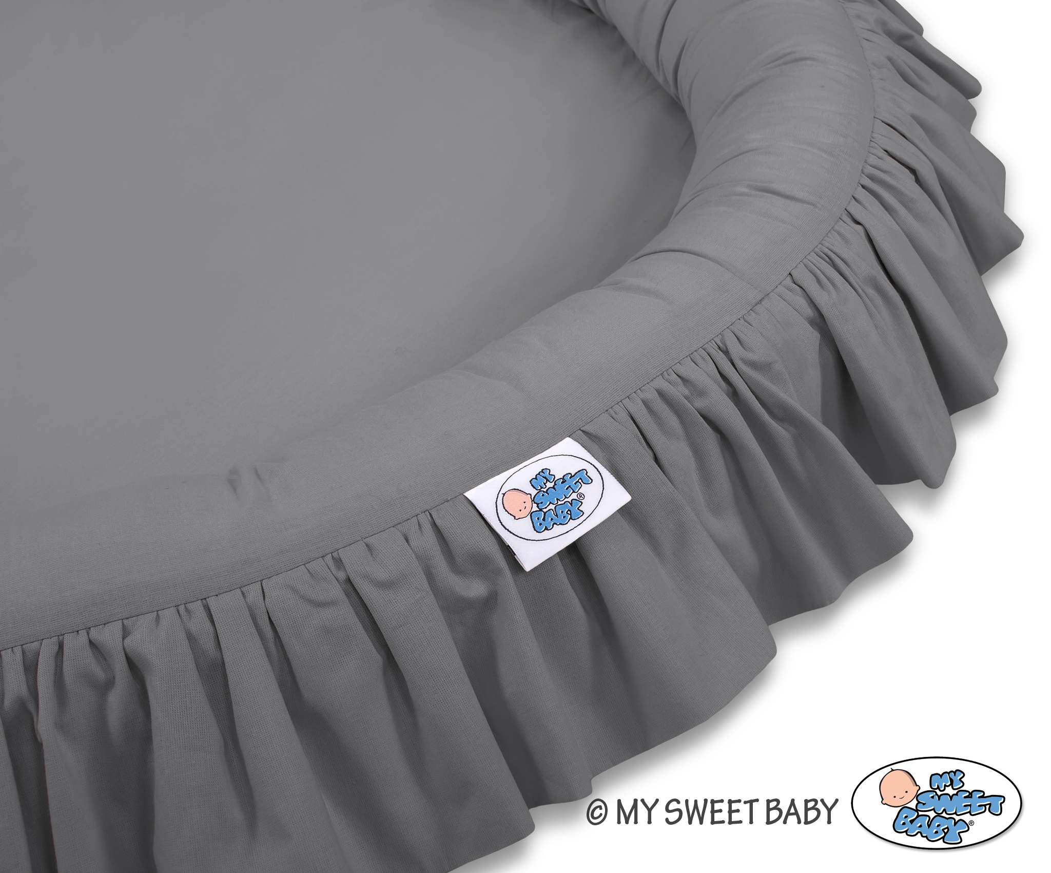 La housse est fabriquée en coton 100% certifié OKOTEX. Le bord est rempli d'un rembourrage approuvé et non allergène : Fibres Eco -Fillball. Elles sont douces, résistantes et assurent une bonne circulation de l'air. Le fond du nid à volants est fait d'un matériau moderne, antiallergique et attesté. La garniture du fond peut être enlevée et le couvercle lavable à 30 degrés.