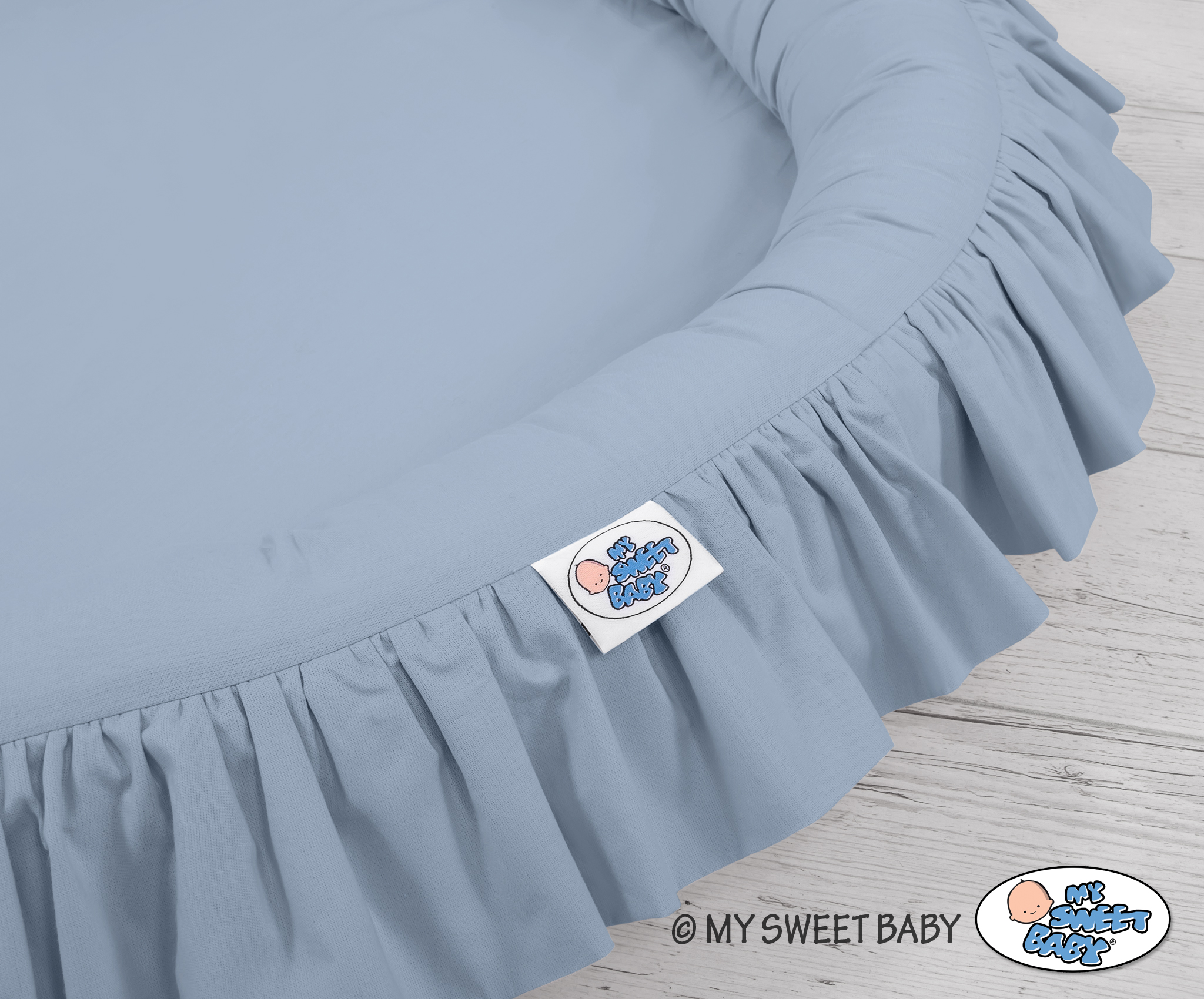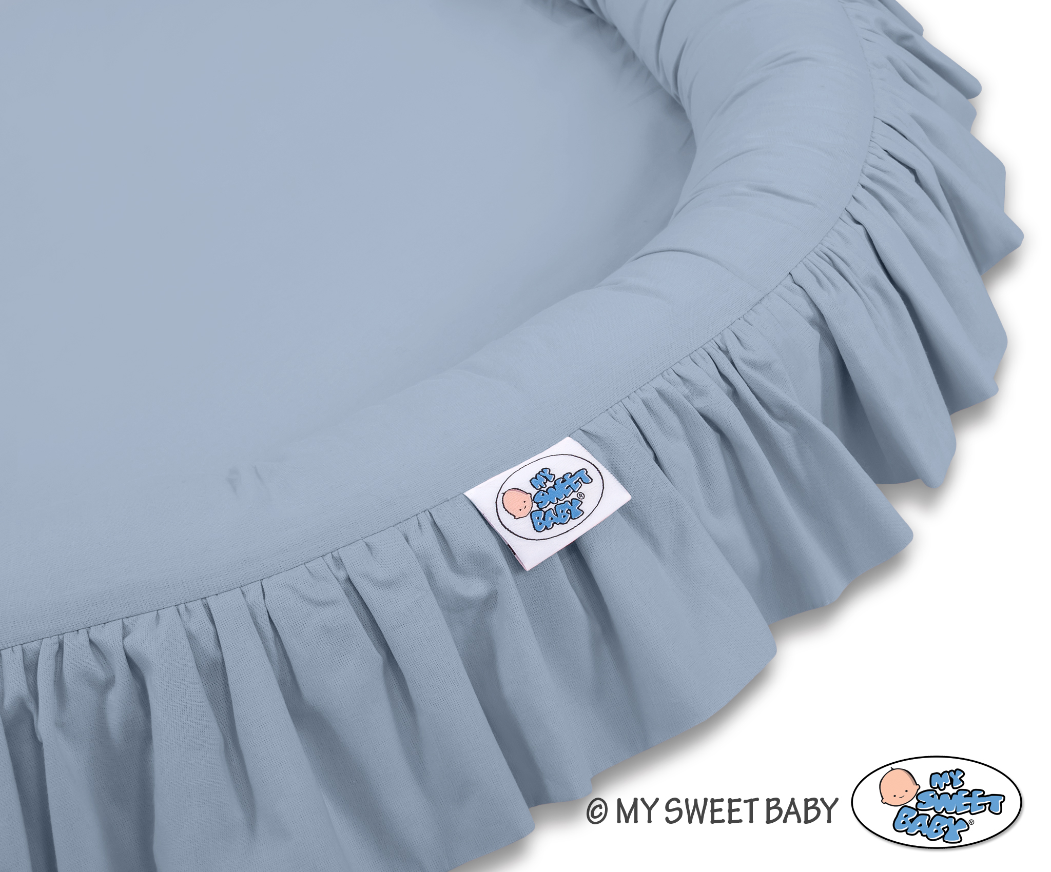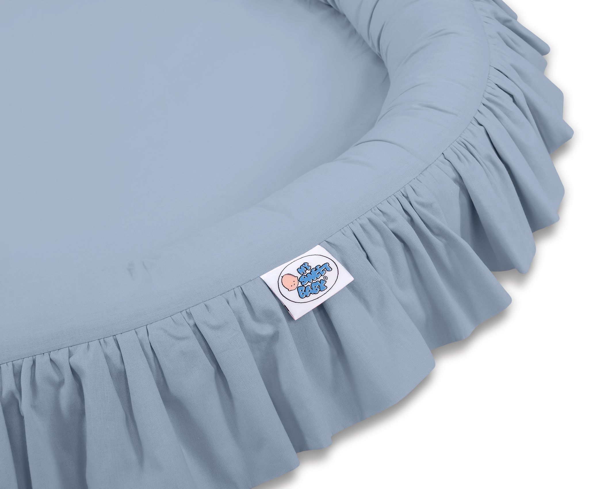 La housse est fabriquée en coton 100% certifié OKOTEX. Le bord est rempli d'un rembourrage approuvé et non allergène : Fibres Eco -Fillball. Elles sont douces, résistantes et assurent une bonne circulation de l'air. Le fond du nid à volants est fait d'un matériau moderne, antiallergique et attesté. La garniture du fond peut être enlevée et le couvercle lavable à 30 degrés.