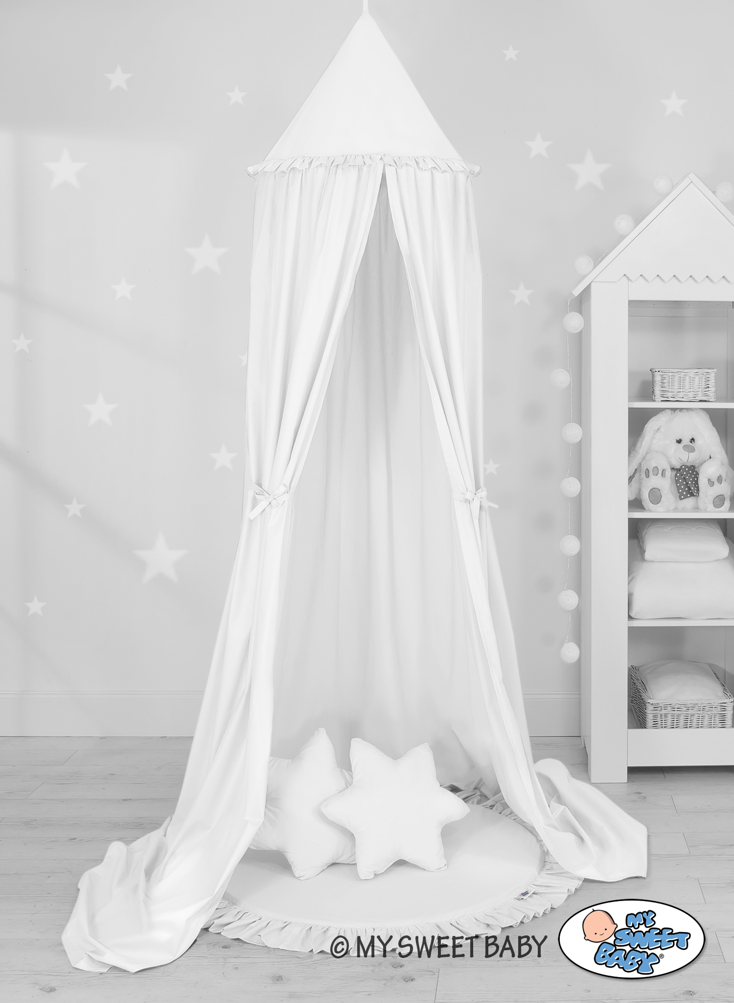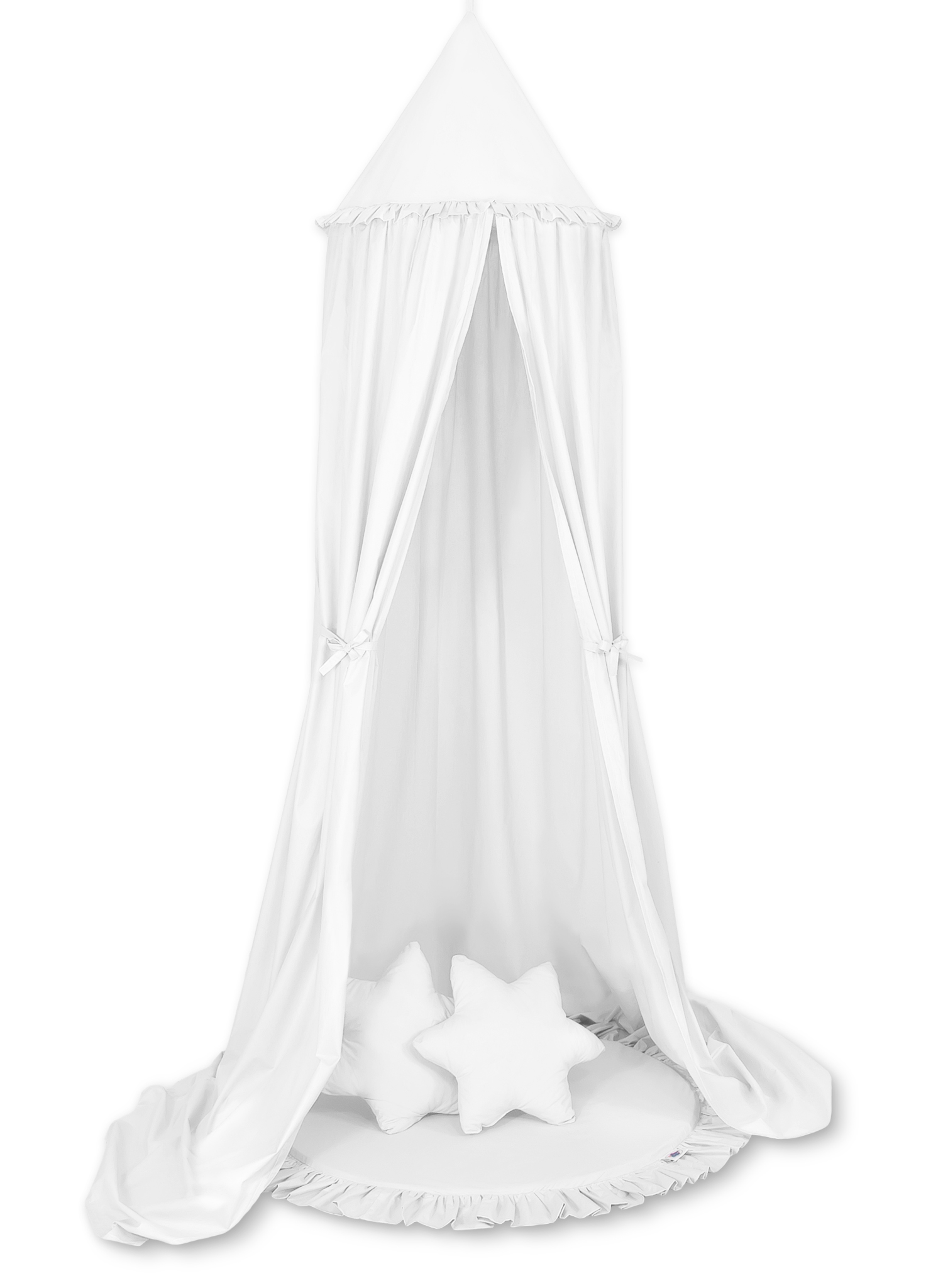Un long baldaquin suspendu efficace. Un bel élément dans la chambre des enfants. Il peut être utilisé comme décoration unique d'un lit de bébé, tout comme il peut créer un endroit merveilleux pour jouer. La suspension au-dessus du lit protège contre les excès de lumière et de bruit, créant ainsi un endroit confortable et sûr pour se reposer à l'intérieur du lit. Le baldaquin peut facilement être fixé au plafond. La longueur de 260 cm permet de disposer les extrémités sur le sol. Cela crée une cachette parfaite et une aire de jeu pour les enfants plus âgés. Le baldaquin est fabriqué en tissu 100% coton certifié Okotex. Sur les côtés, il y a des rubans pratiques pour attacher le baldaquin et créer une belle tente. Le bord du haut peut être enlevé. Le tissu est lavable à 30 degrés.
