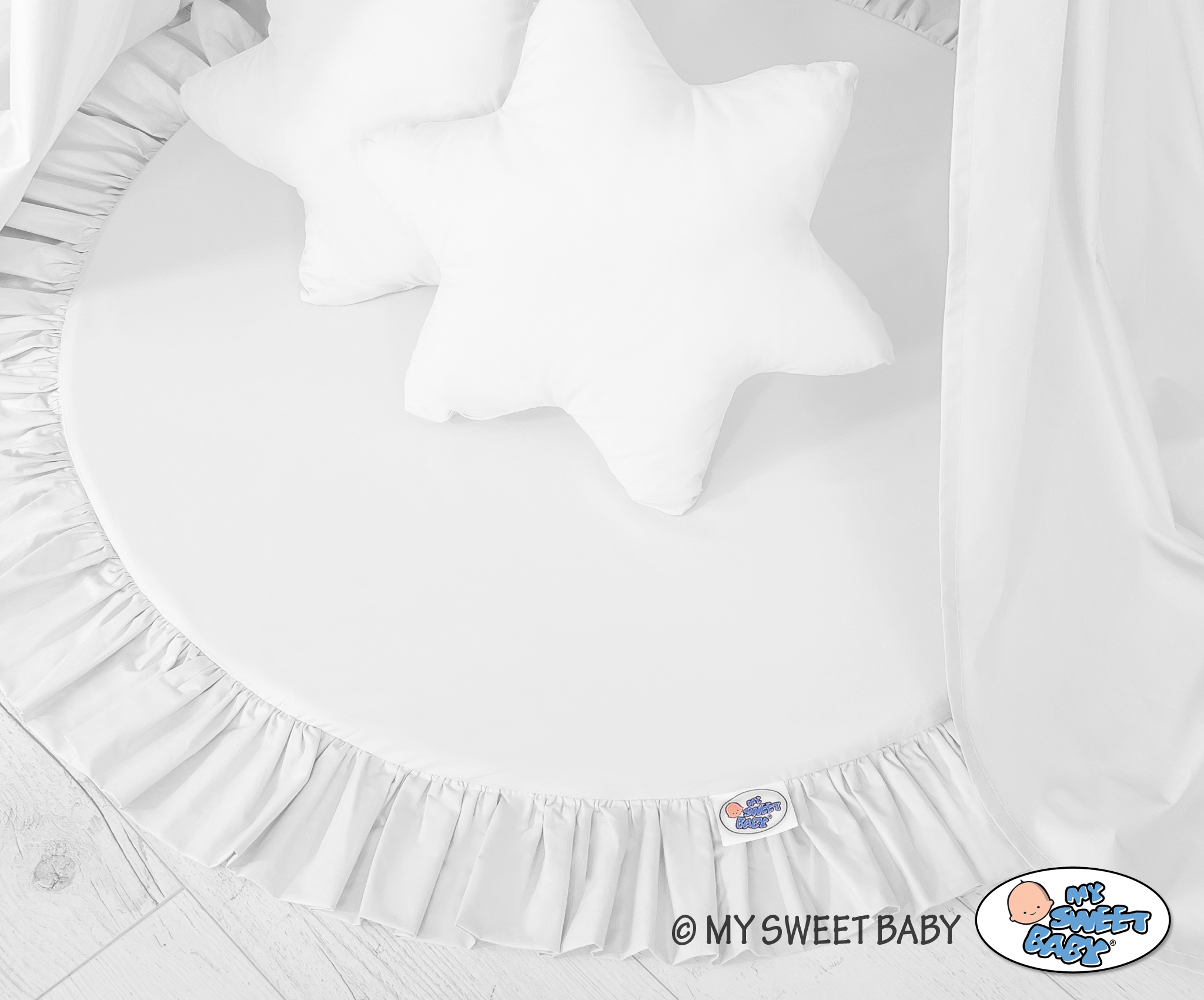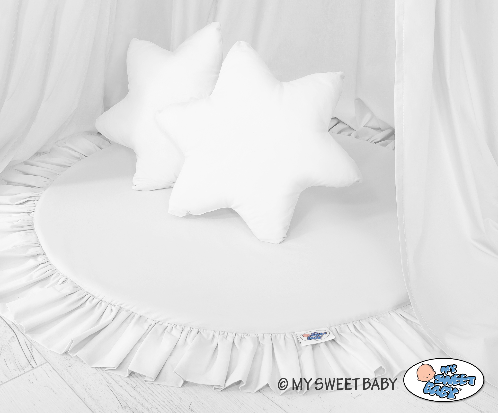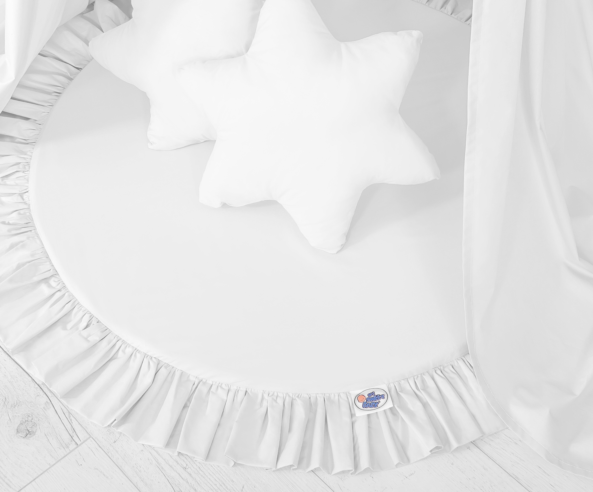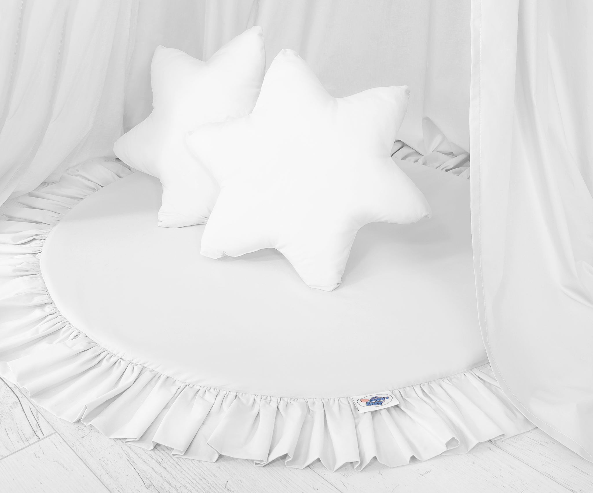 Un tapis de jeu de sol avec des volants. Il peut être utilisé comme tapis, tapis de jeu ou comme tapis de sol pour le long baldaquin. Dès les premiers jours de la vie, il peut être utilisé comme lieu de repos ou comme tapis de jeu pour le temps du passage sur le ventre. Il a un rembourrage souple qui l'isole parfaitement du sol dur et froid. La couverture est fabriquée en coton 100% certifié OKOTEX. Le dessous du tapis de jeu est fait d'un matériau moderne, antiallergique et attesté. Le fond peut être retiré et la couverture peut être lavée.