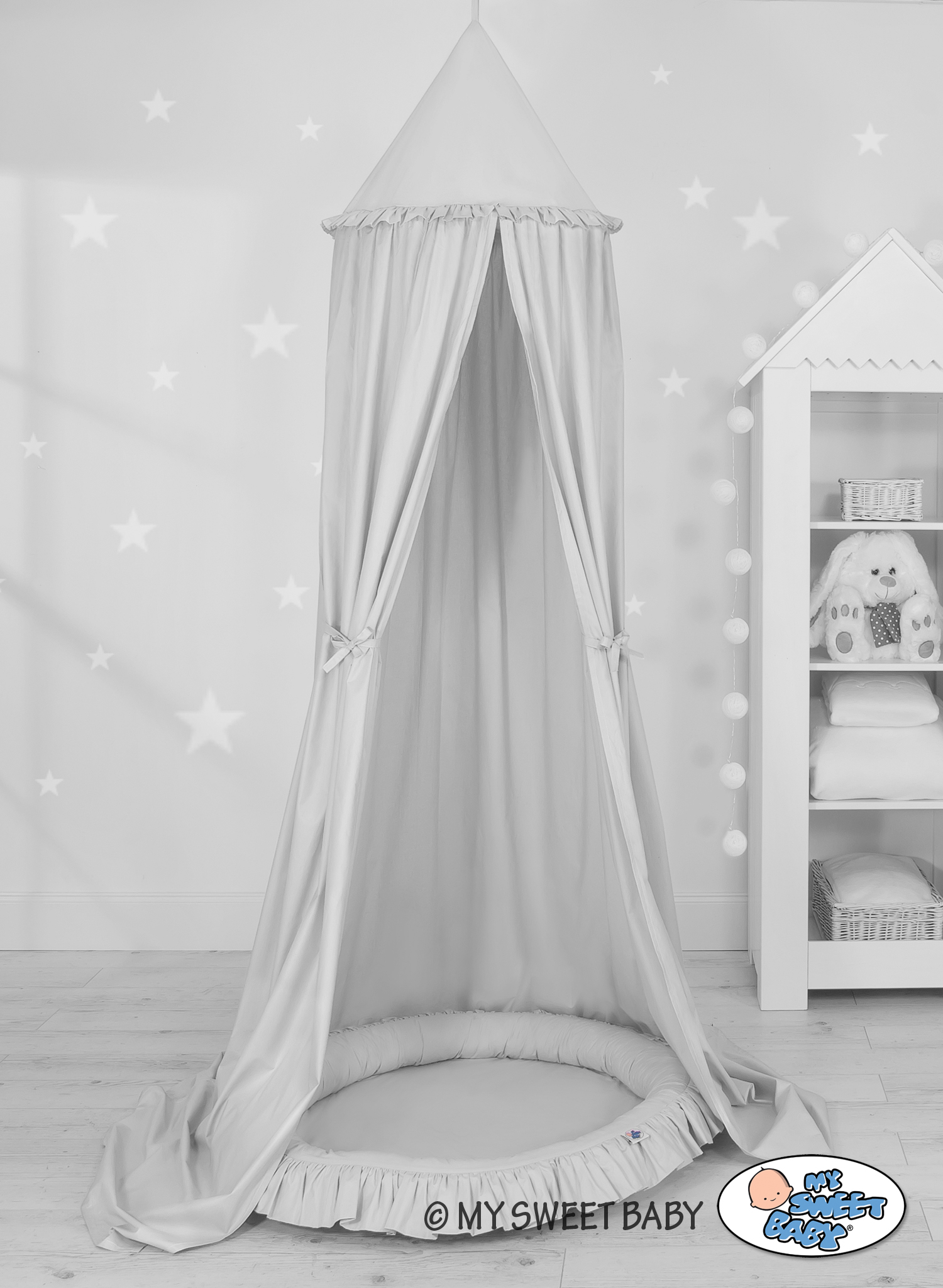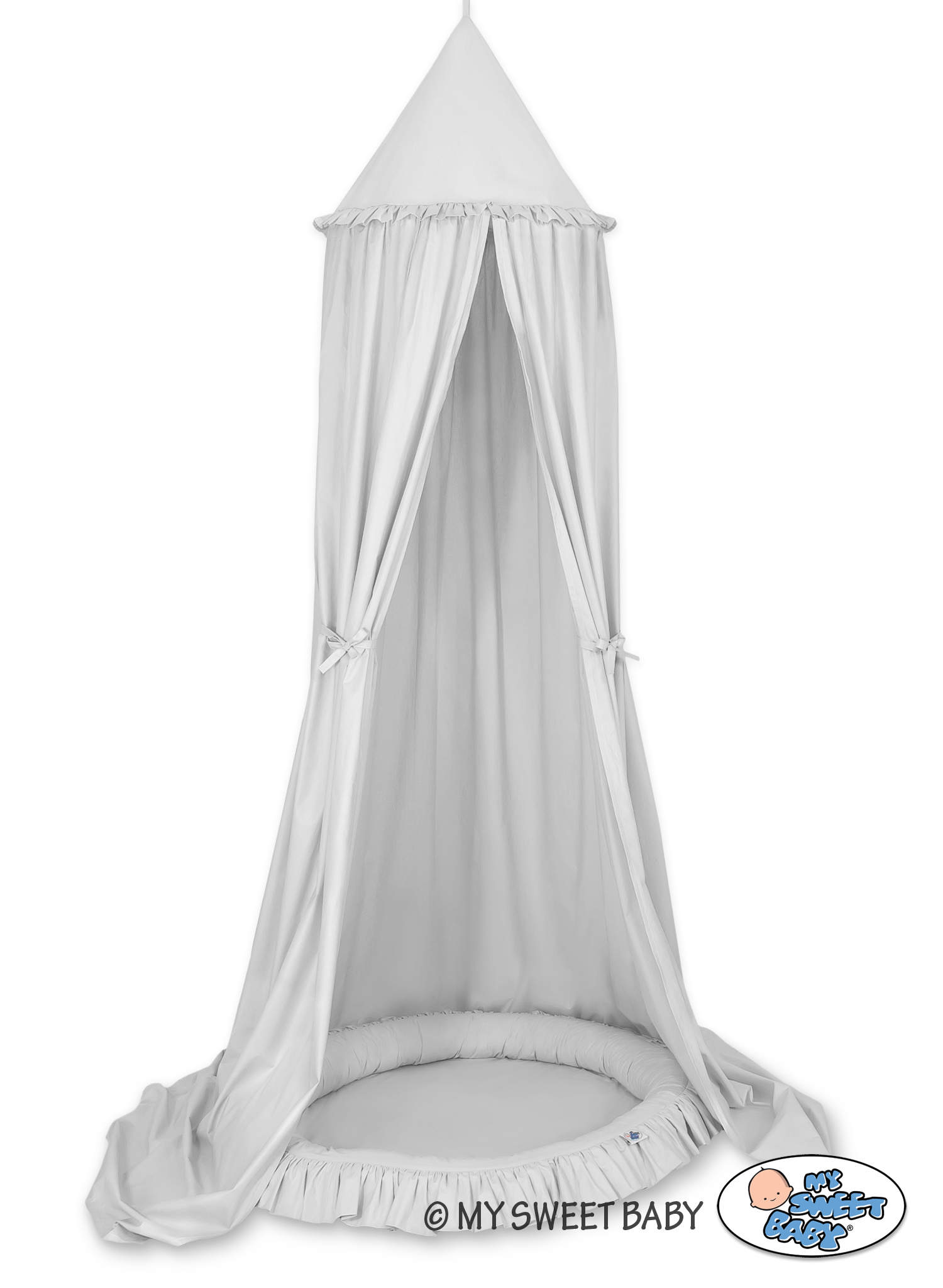 Un long baldaquin suspendu efficace. Un bel élément dans la chambre des enfants. Il peut être utilisé comme décoration unique d'un lit de bébé, tout comme il peut créer un endroit merveilleux pour jouer. La suspension au-dessus du lit protège contre les excès de lumière et de bruit, créant ainsi un endroit confortable et sûr pour se reposer à l'intérieur du lit. Le baldaquin peut facilement être fixé au plafond. La longueur de 260 cm permet de disposer les extrémités sur le sol. Cela crée une cachette parfaite et une aire de jeu pour les enfants plus âgés. Le baldaquin est fabriqué en tissu 100% coton certifié Okotex. Sur les côtés, il y a des rubans pratiques pour attacher le baldaquin et créer une belle tente. Le bord du haut peut être enlevé. Le tissu est lavable à 30 degrés.