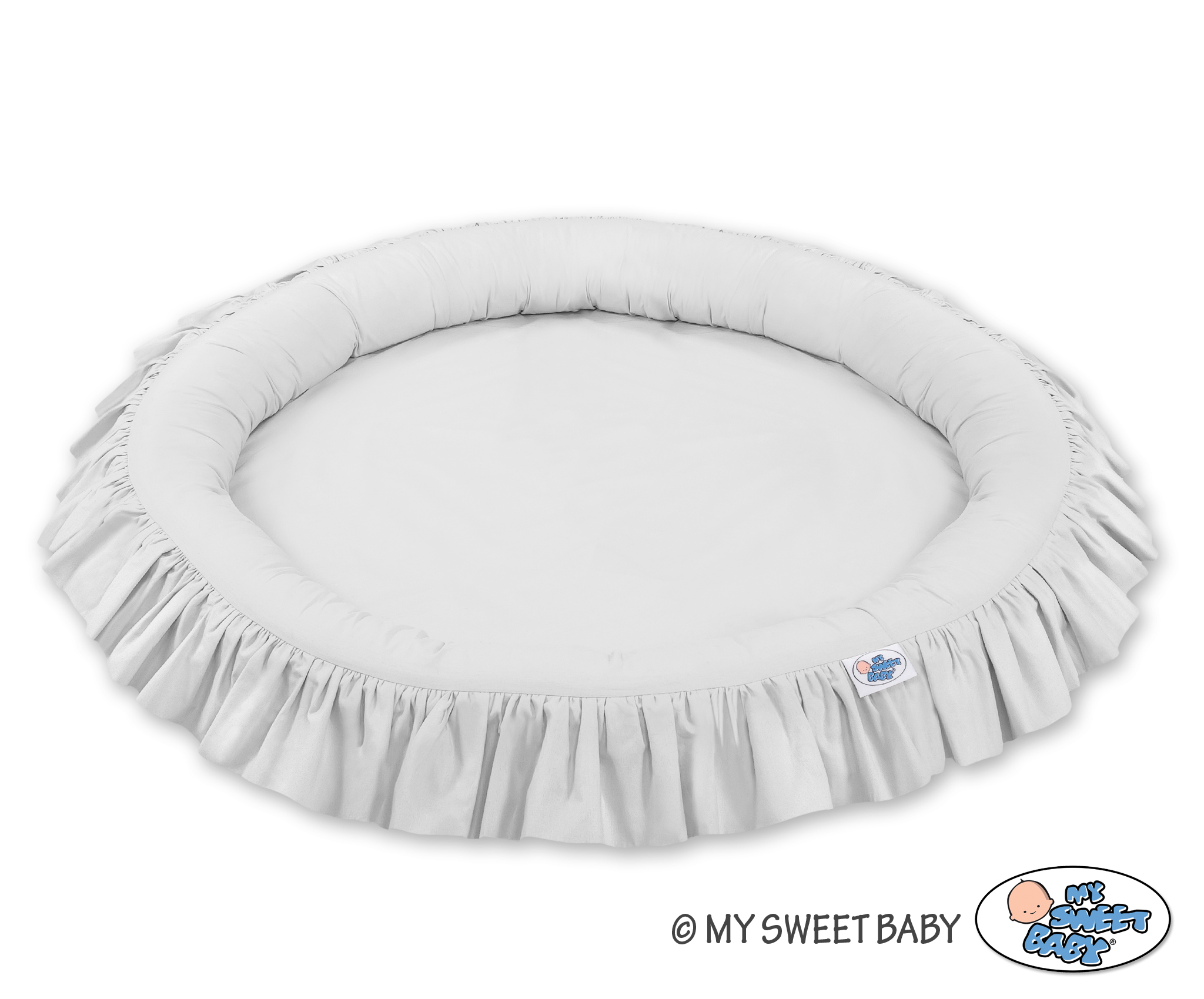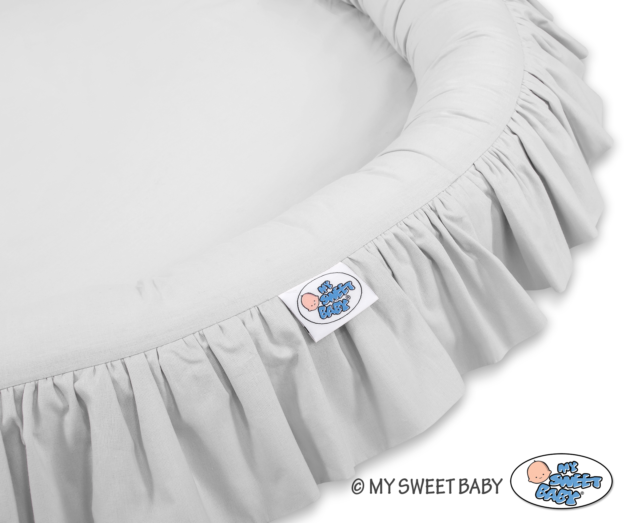 La housse est fabriquée en coton 100% certifié OKOTEX. Le bord est rempli d'un rembourrage approuvé et non allergène : Fibres Eco -Fillball. Elles sont douces, résistantes et assurent une bonne circulation de l'air. Le fond du nid à volants est fait d'un matériau moderne, antiallergique et attesté. La garniture du fond peut être enlevée et le couvercle lavable à 30 degrés.
