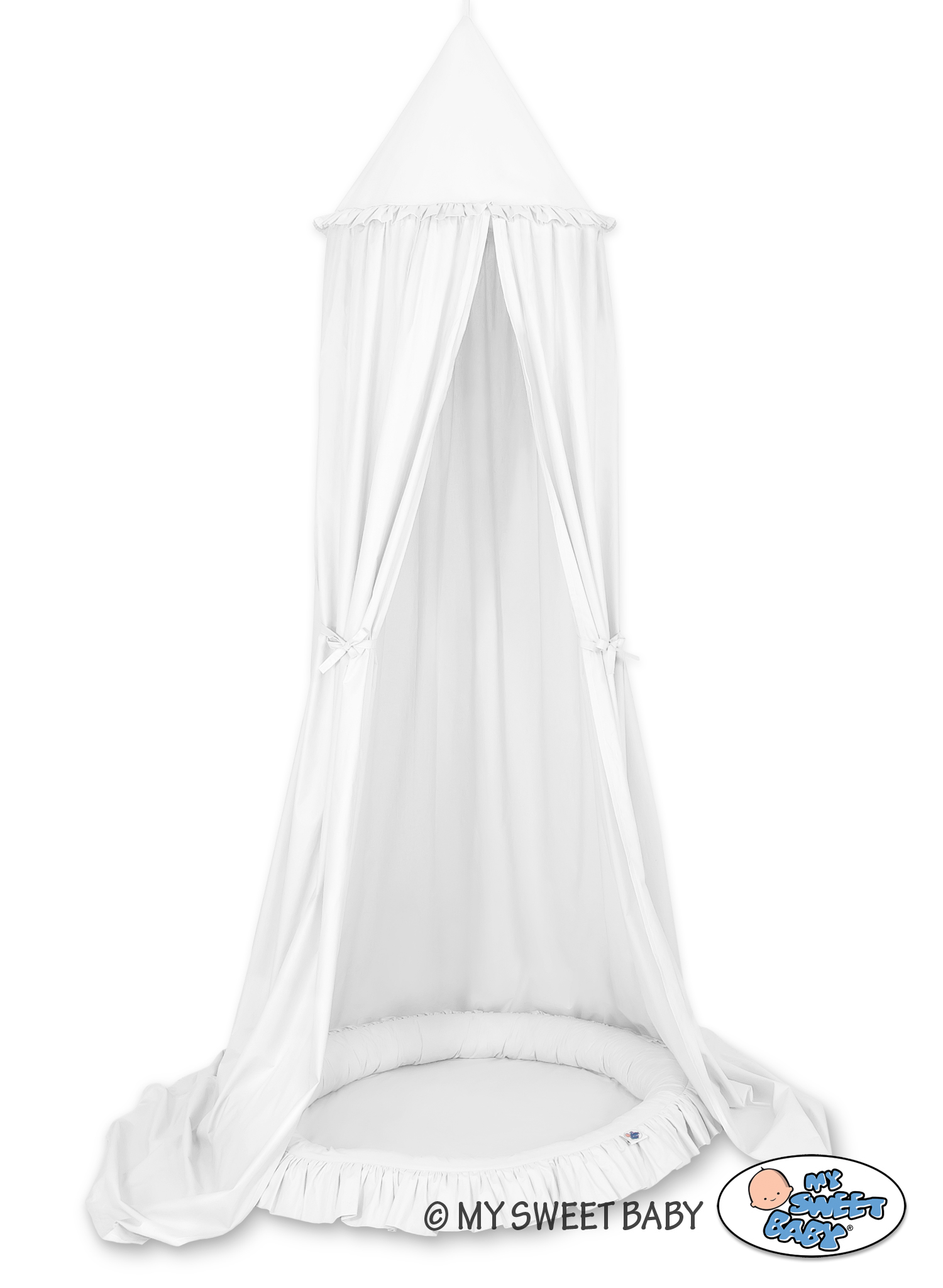 Un long baldaquin suspendu efficace. Un bel élément dans la chambre des enfants. Il peut être utilisé comme décoration unique d'un lit de bébé, tout comme il peut créer un endroit merveilleux pour jouer. La suspension au-dessus du lit protège contre les excès de lumière et de bruit, créant ainsi un endroit confortable et sûr pour se reposer à l'intérieur du lit. Le baldaquin peut facilement être fixé au plafond. La longueur de 260 cm permet de disposer les extrémités sur le sol. Cela crée une cachette parfaite et une aire de jeu pour les enfants plus âgés. Le baldaquin est fabriqué en tissu 100% coton certifié Okotex. Sur les côtés, il y a des rubans pratiques pour attacher le baldaquin et créer une belle tente. Le bord du haut peut être enlevé. Le tissu est lavable à 30 degrés.