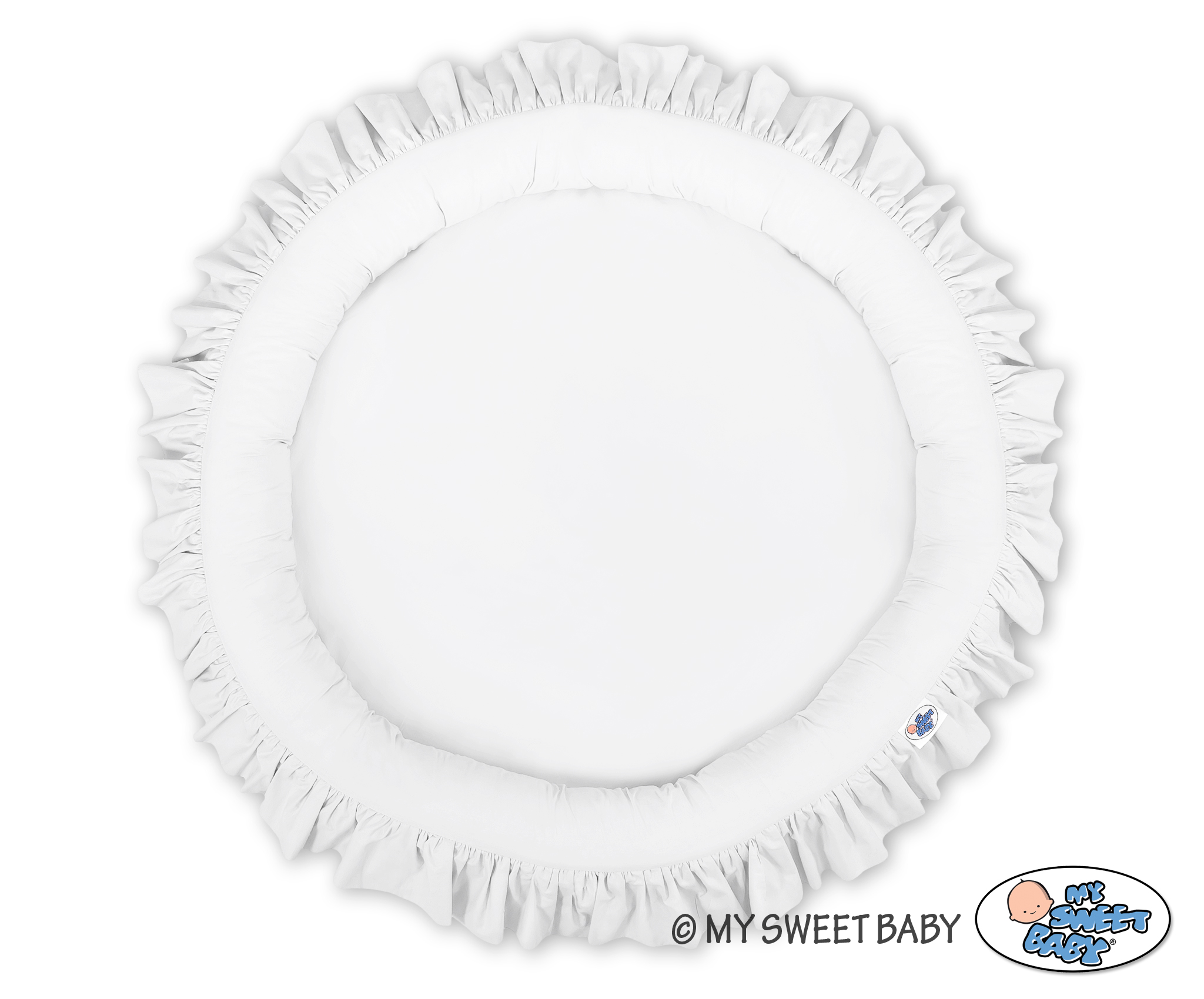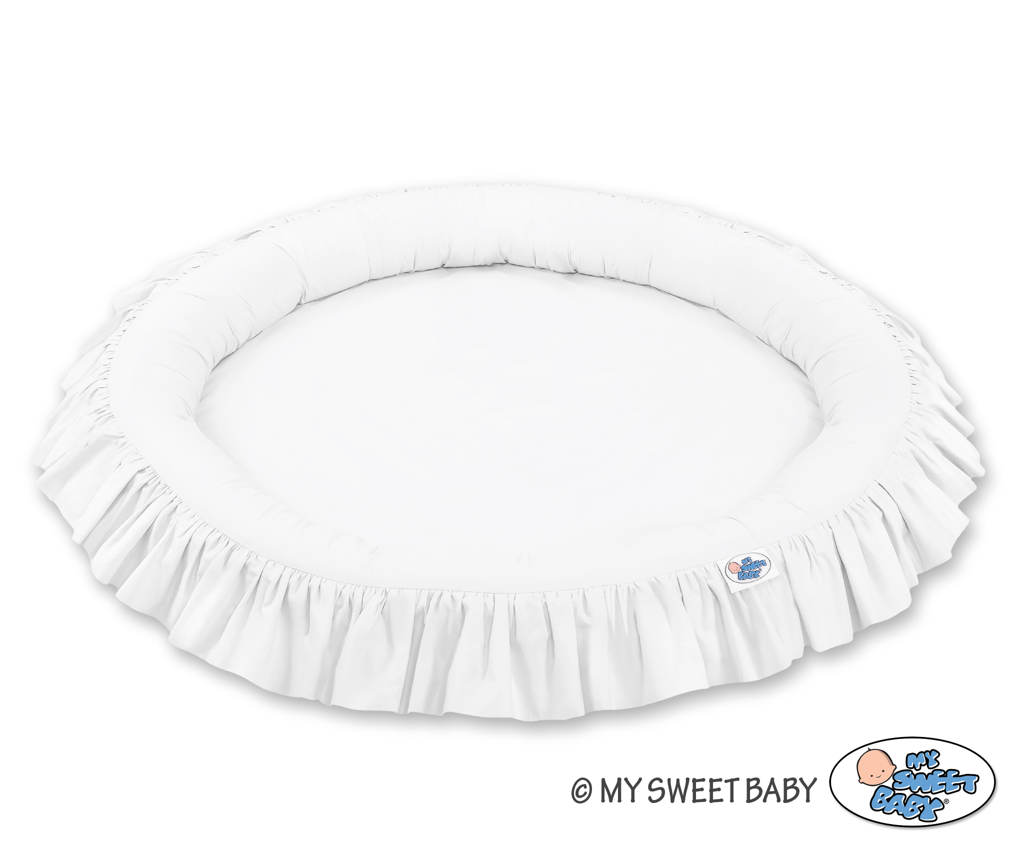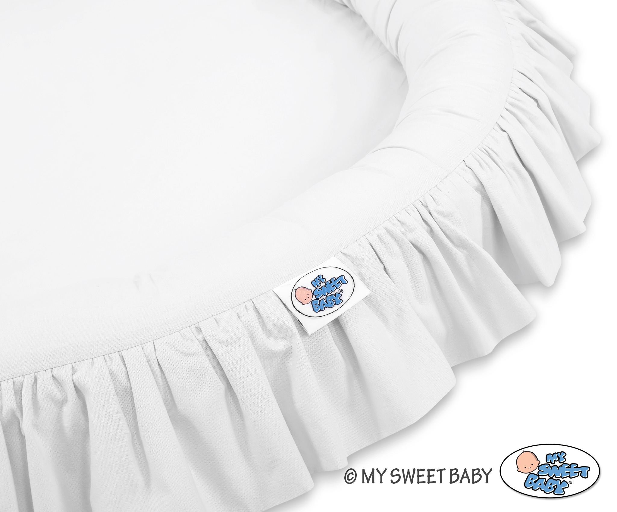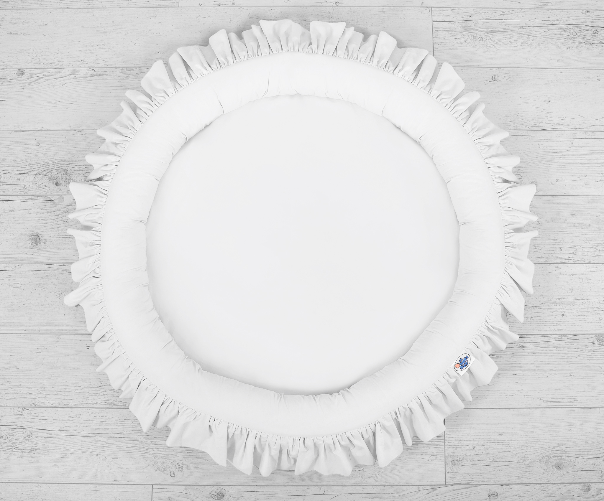 La housse est fabriquée en coton 100% certifié OKOTEX. Le bord est rempli d'un rembourrage approuvé et non allergène : Fibres Eco -Fillball. Elles sont douces, résistantes et assurent une bonne circulation de l'air. Le fond du nid à volants est fait d'un matériau moderne, antiallergique et attesté. La garniture du fond peut être enlevée et le couvercle lavable à 30 degrés.