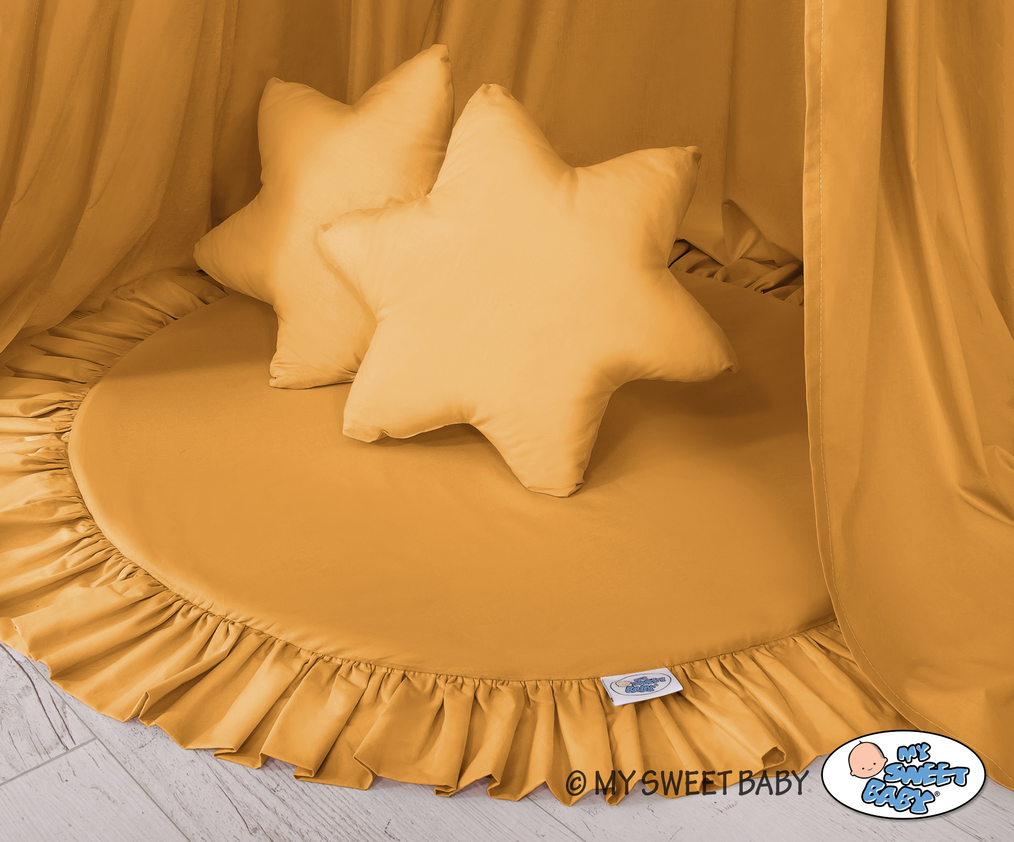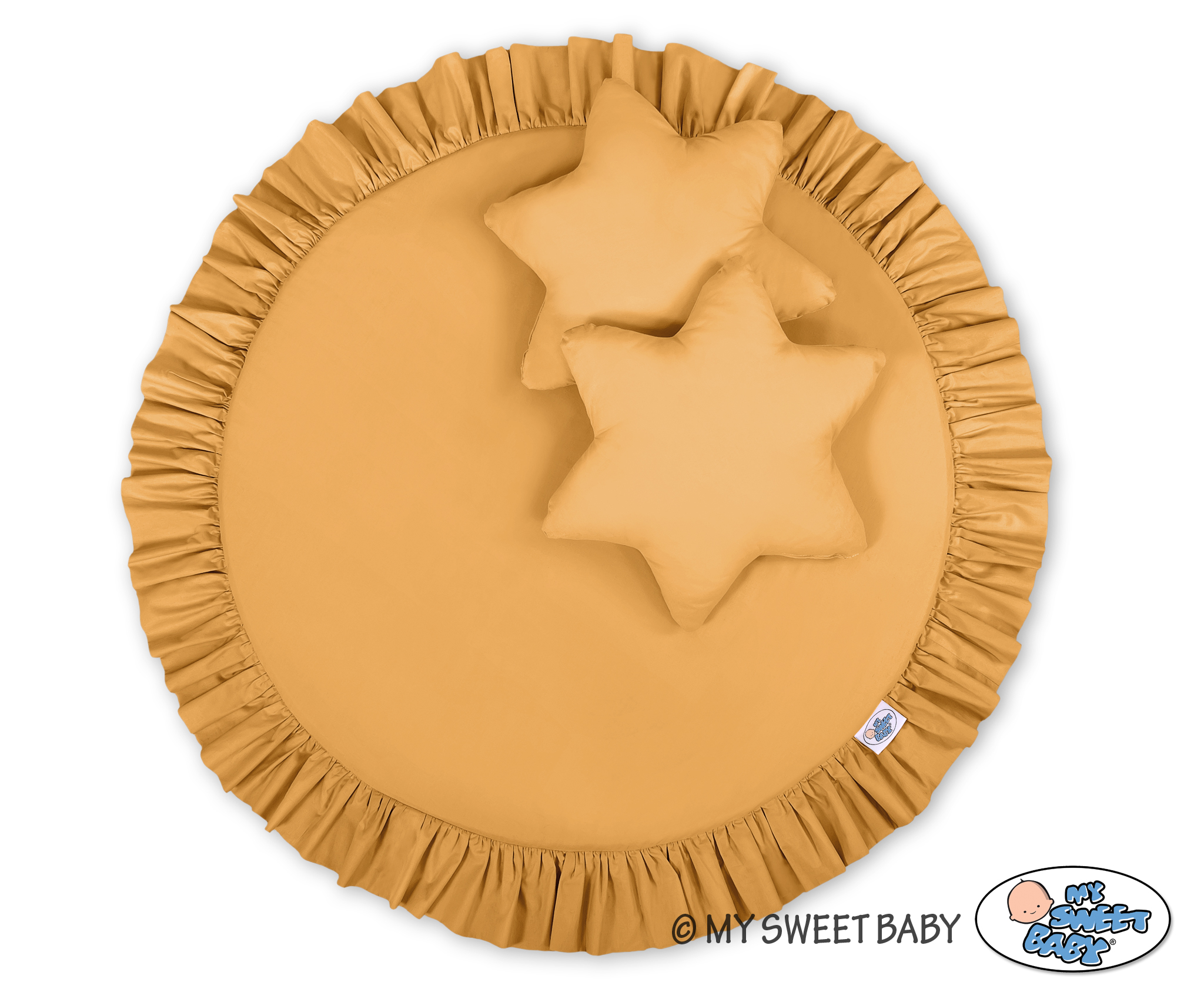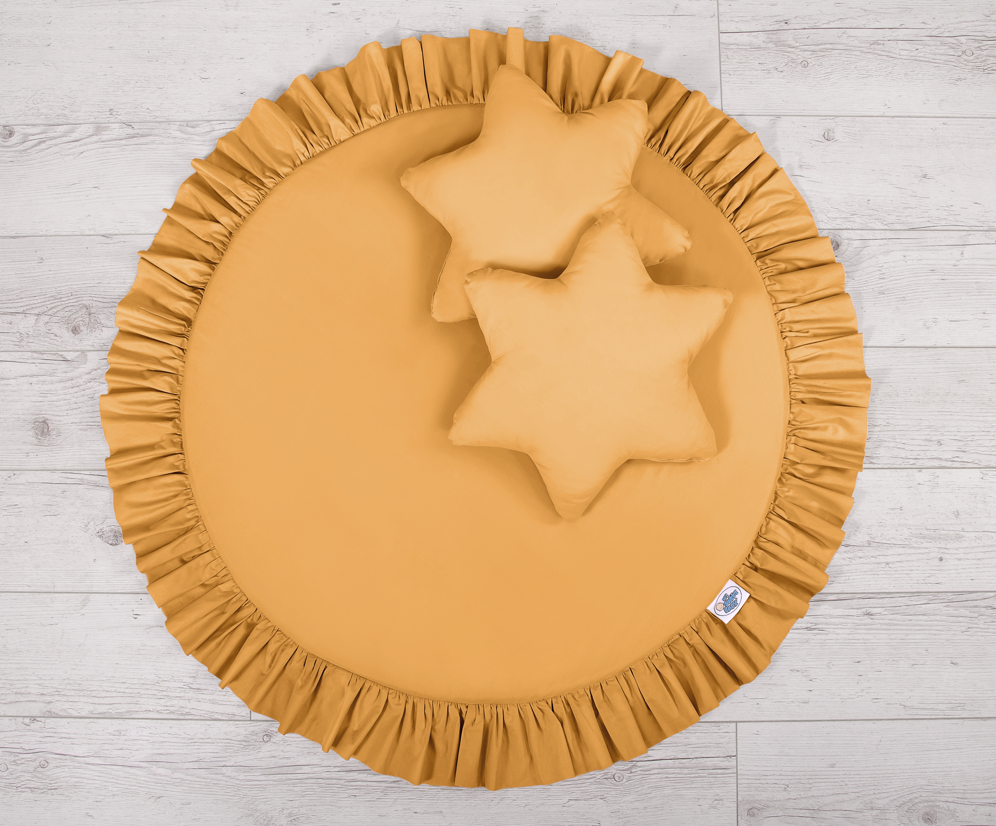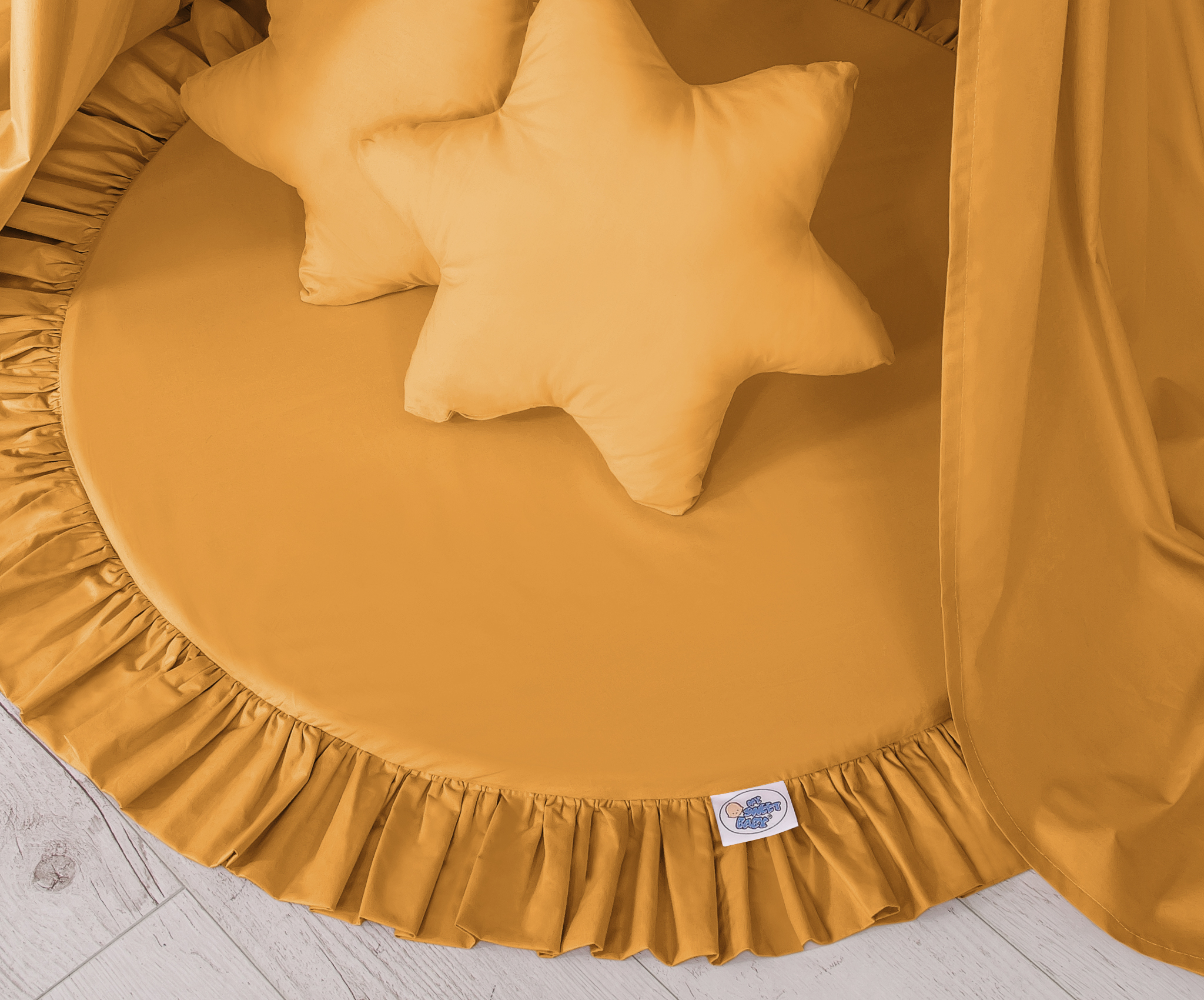 Un tapis de jeu de sol avec des volants. Il peut être utilisé comme tapis, tapis de jeu ou comme tapis de sol pour le long baldaquin. Dès les premiers jours de la vie, il peut être utilisé comme lieu de repos ou comme tapis de jeu pour le temps du passage sur le ventre. Il a un rembourrage souple qui l'isole parfaitement du sol dur et froid. La couverture est fabriquée en coton 100% certifié OKOTEX. Le dessous du tapis de jeu est fait d'un matériau moderne, antiallergique et attesté. Le fond peut être retiré et la couverture peut être lavée.