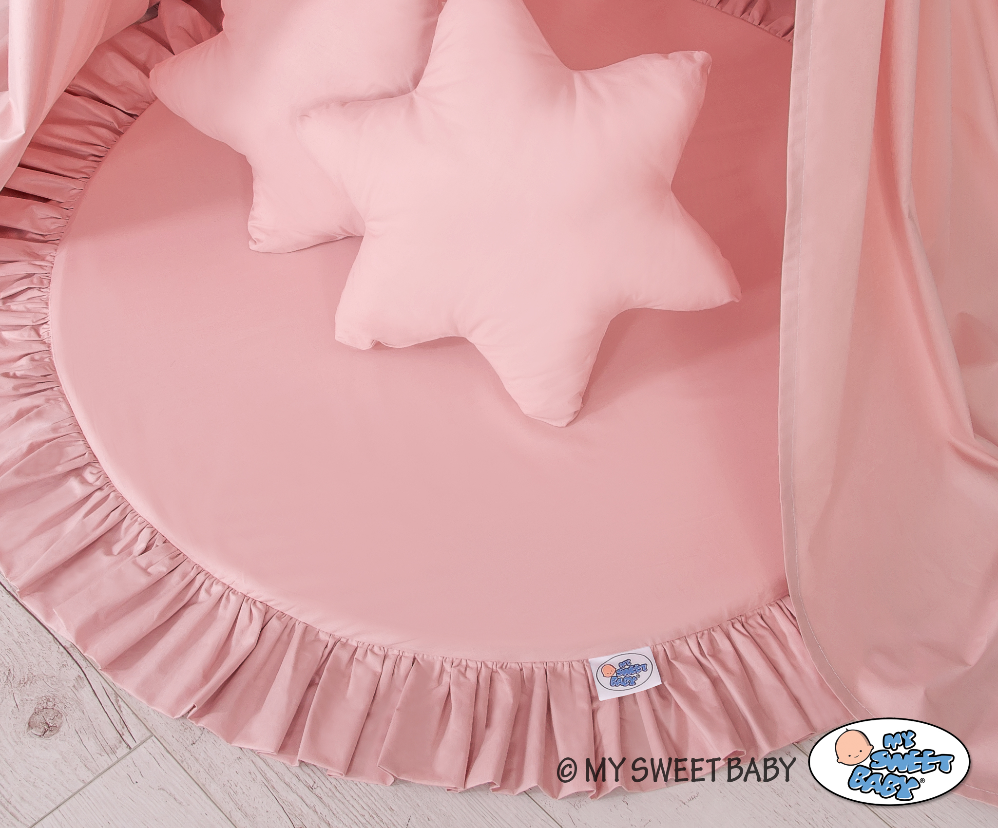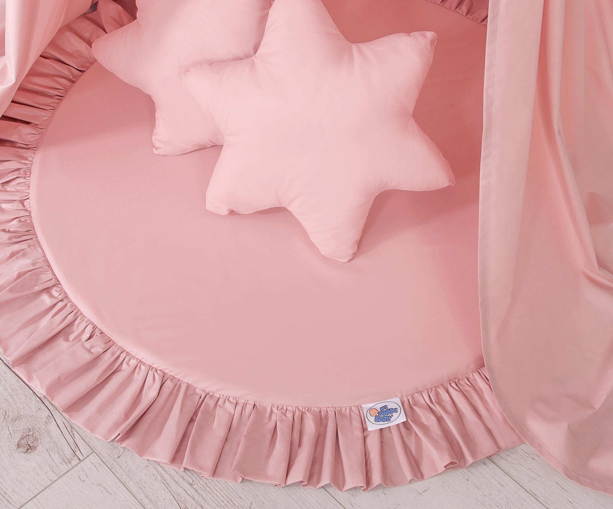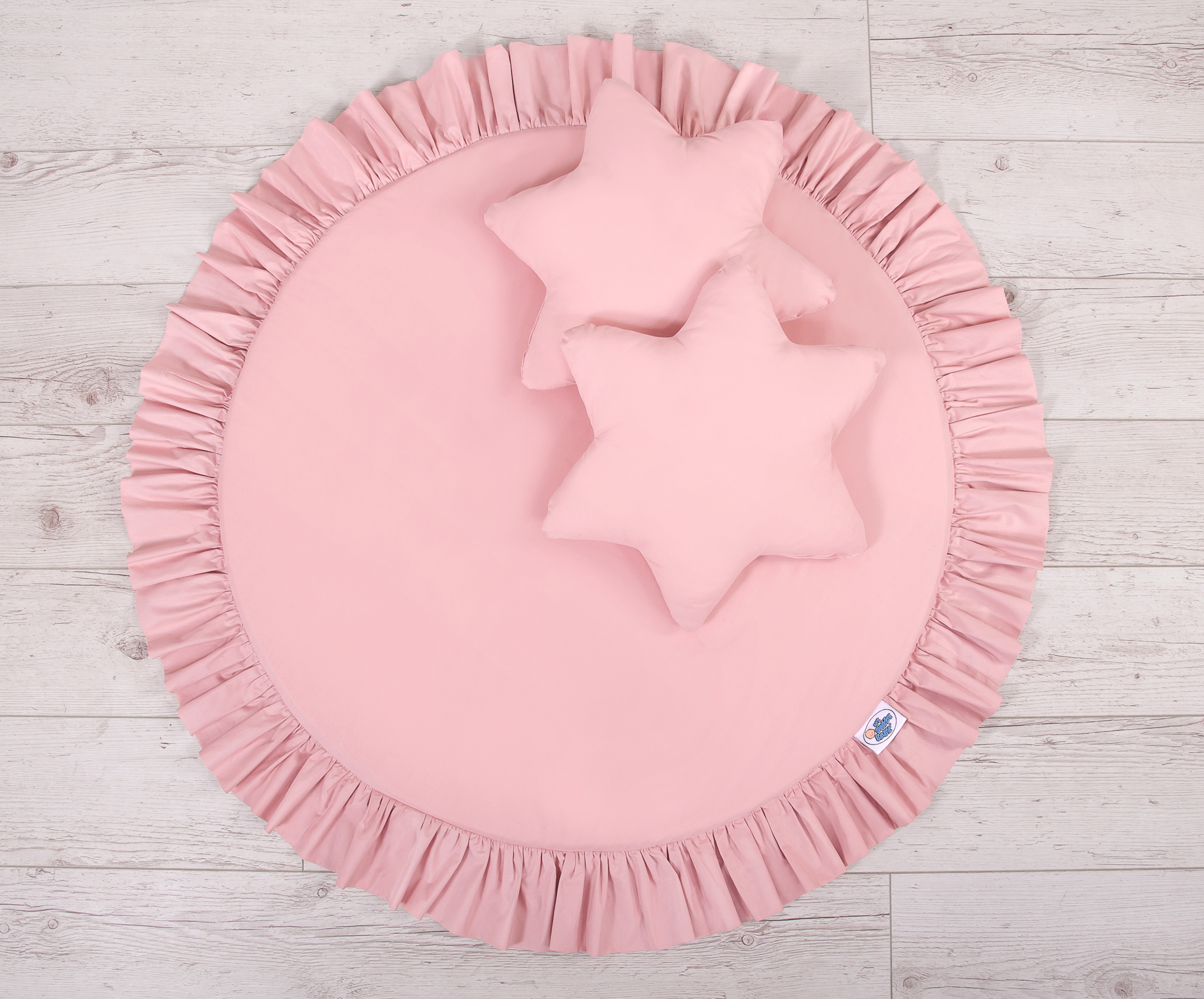 Un tapis de jeu de sol avec des volants. Il peut être utilisé comme tapis, tapis de jeu ou comme tapis de sol pour le long baldaquin. Dès les premiers jours de la vie, il peut être utilisé comme lieu de repos ou comme tapis de jeu pour le temps du passage sur le ventre. Il a un rembourrage souple qui l'isole parfaitement du sol dur et froid. La couverture est fabriquée en coton 100% certifié OKOTEX. Le dessous du tapis de jeu est fait d'un matériau moderne, antiallergique et attesté. Le fond peut être retiré et la couverture peut être lavée.
