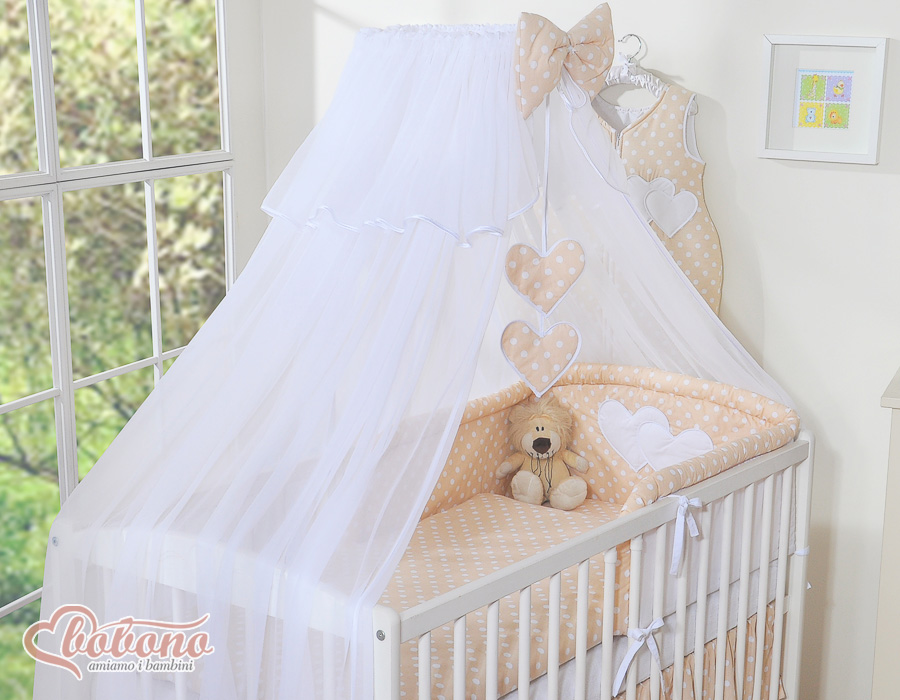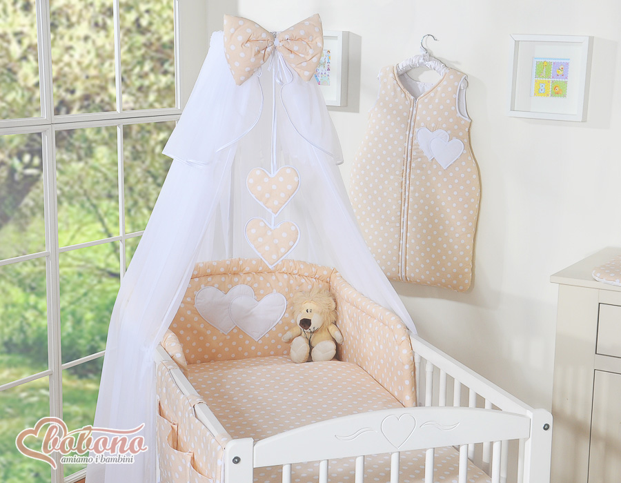 Bébé chambre » Linge de lit bébé » Linge de lit bébé Cœurs » Linge de lit bébé 140cm Cœurs » Parure de linge de lit 11 pcs avec moustiquaire » Ensemble de Linge de Lit Bébé 11 pcs Moustiquaire Beige à Pois Cœurs
