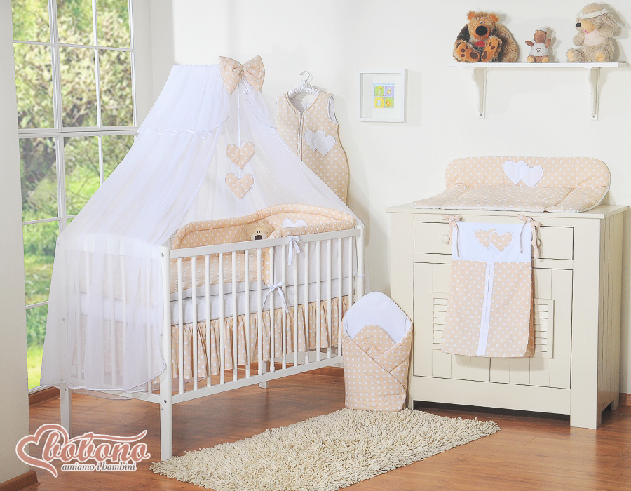 Bébé chambre » Linge de lit bébé » Linge de lit bébé Cœurs » Linge de lit bébé 120cm Cœurs » Ensemble de linge de lit 7 pcs avec moustiquaire » Ensemble de Linge de Lit pour Bébé 7 pcs avec Ciel Beige à Pois Cœurs