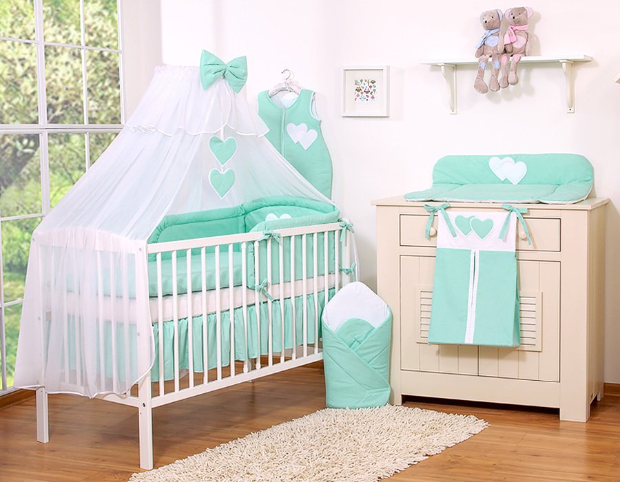 Bébé chambre » Linge de lit bébé » Linge de lit bébé Cœurs » Linge de lit bébé 120cm Cœurs » Ensemble de linge de lit 7 pcs avec moustiquaire » Ensemble de Linge de Lit pour Bébé 7 pcs avec Ciel Menthe Cœurs