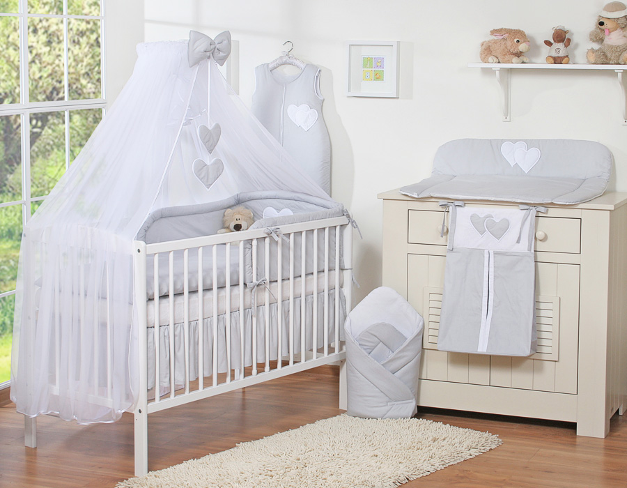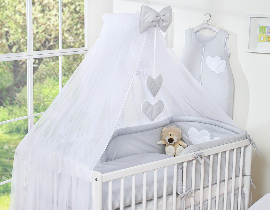 Ensemble Linge de Lit Bebe 5 pcs Moustiquaire Gris Cœurs
