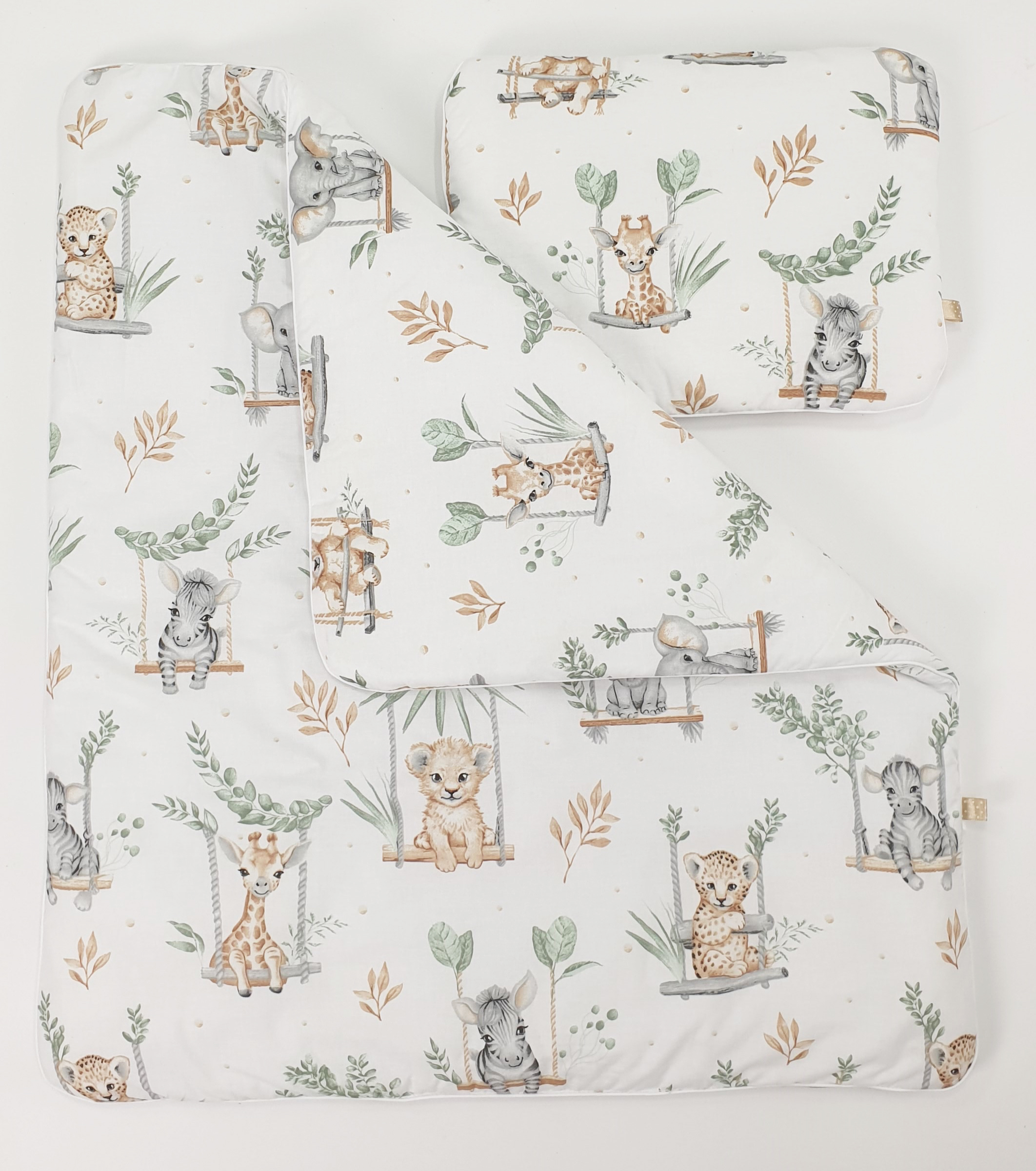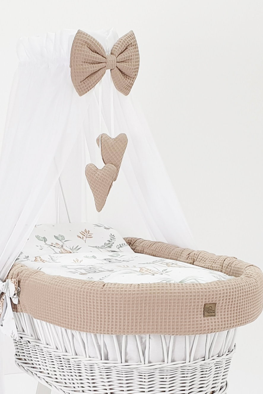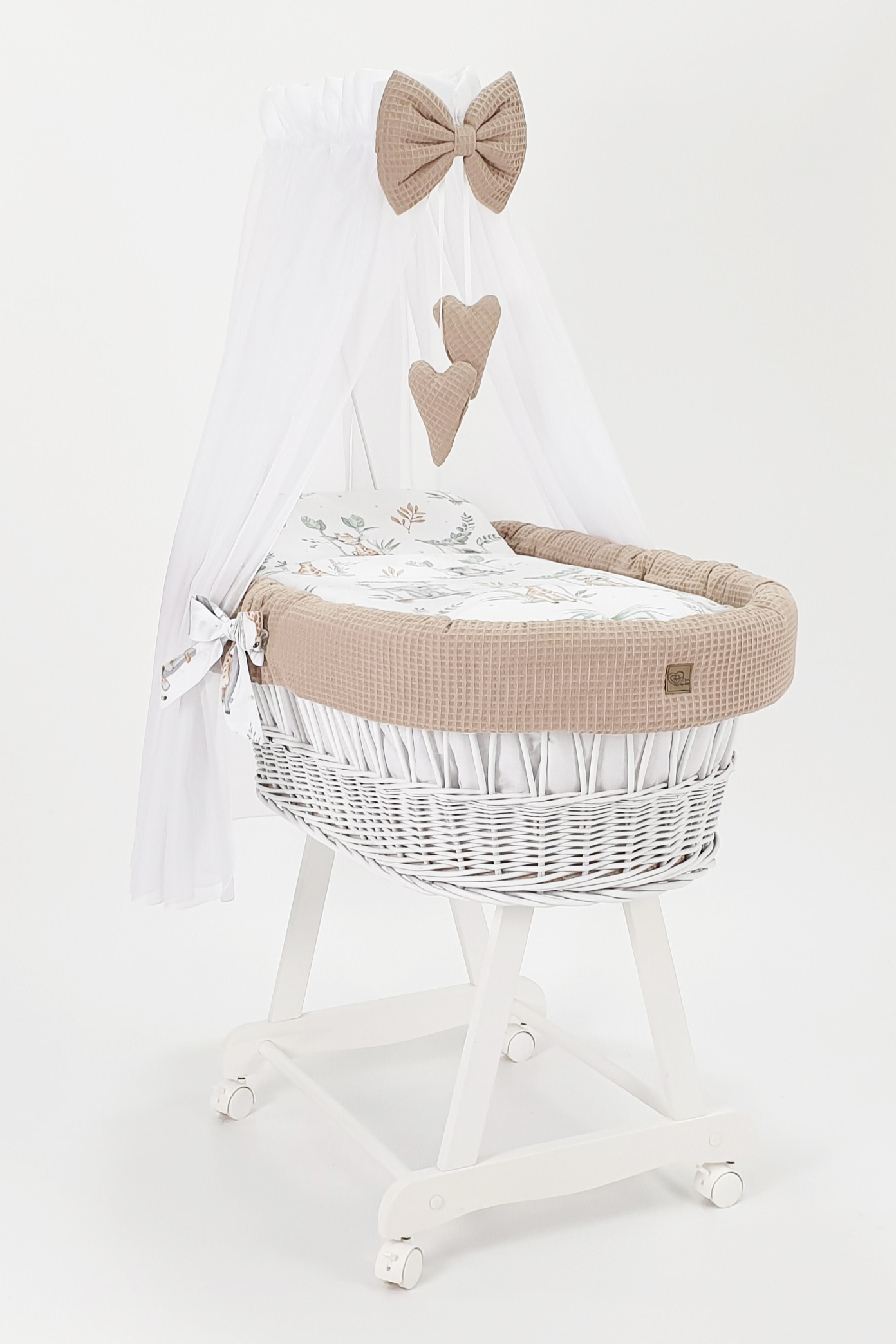 Commandez maintenant cet habillage complet blanc (motif Safari) pour transformer votre couffin en osier en un nid chaleureux et sécurisé - parfait dès la naissance.