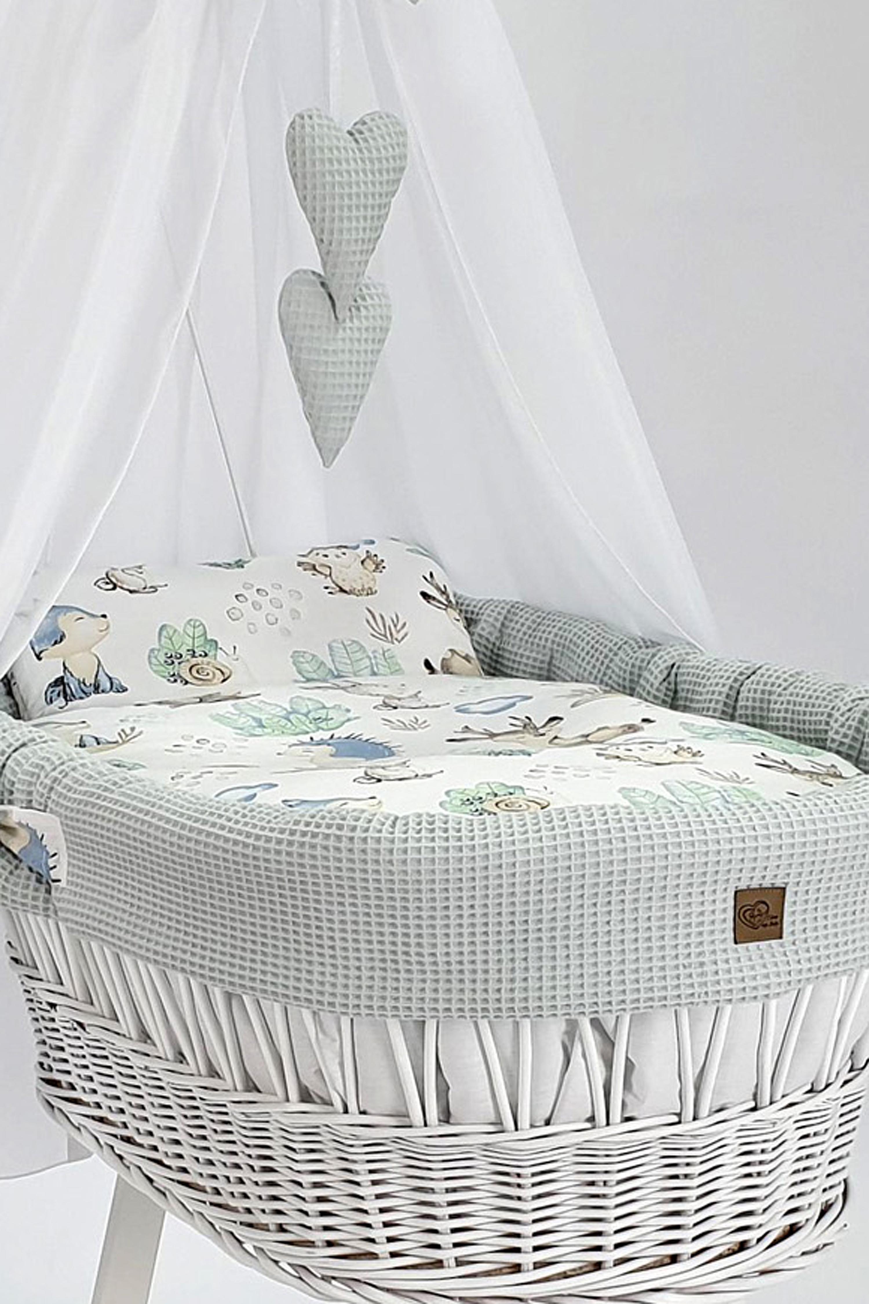 Commandez maintenant cet habillage complet blanc (motif petites hérissons) pour transformer votre couffin en osier en un nid chaleureux et sécurisé - parfait dès la naissance.
