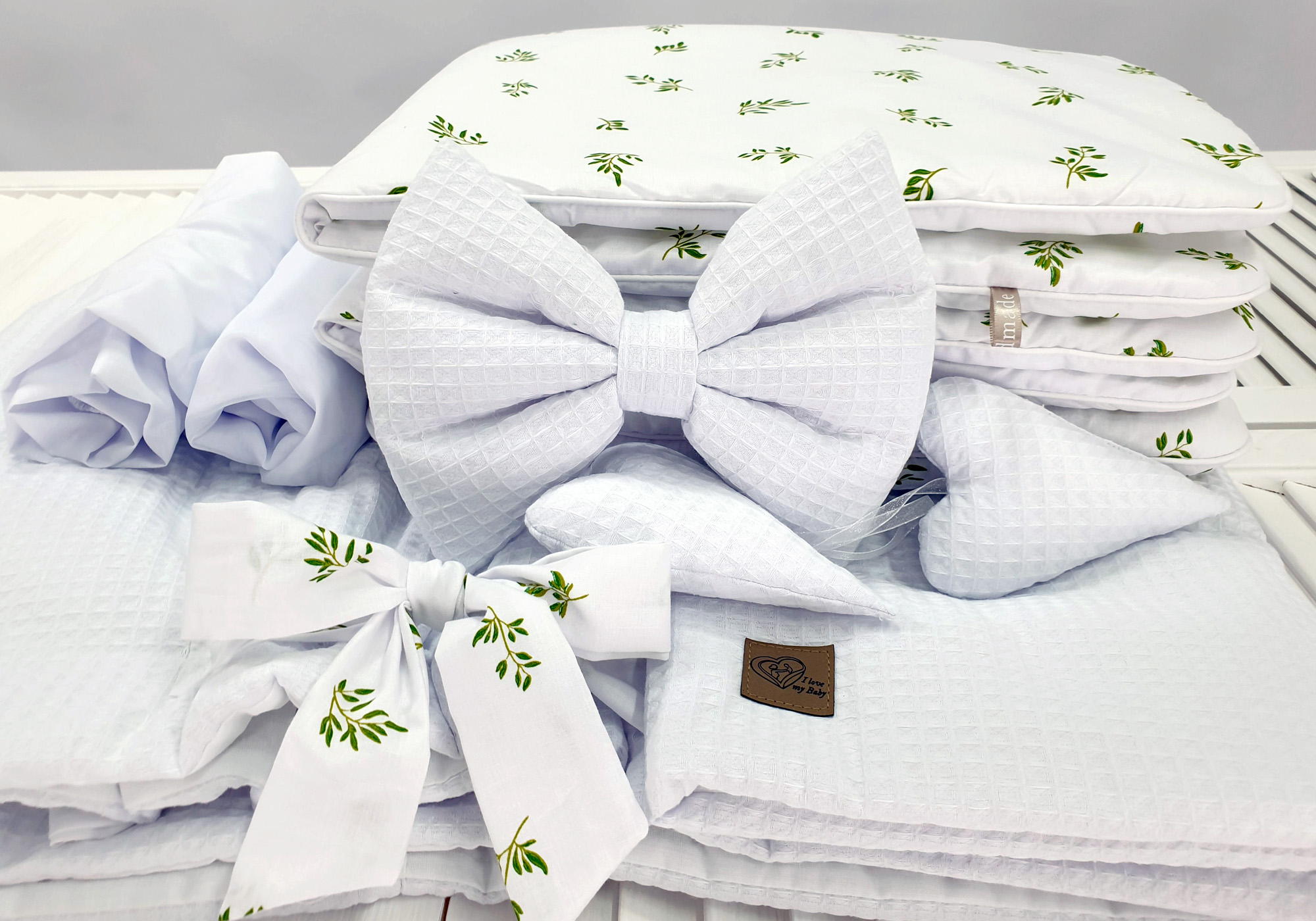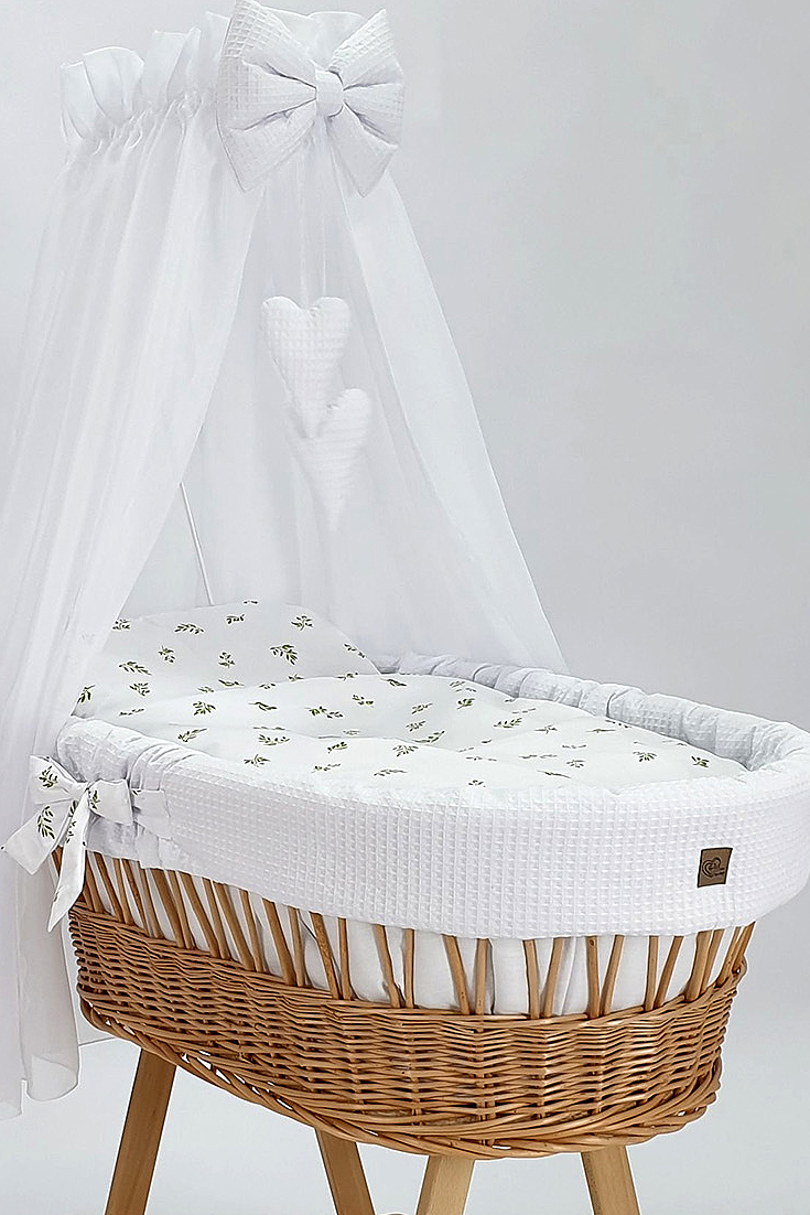 Commandez maintenant cet habillage complet blanc (motif petites brindilles) pour transformer votre couffin en osier en un nid chaleureux et sécurisé - parfait dès la naissance.
