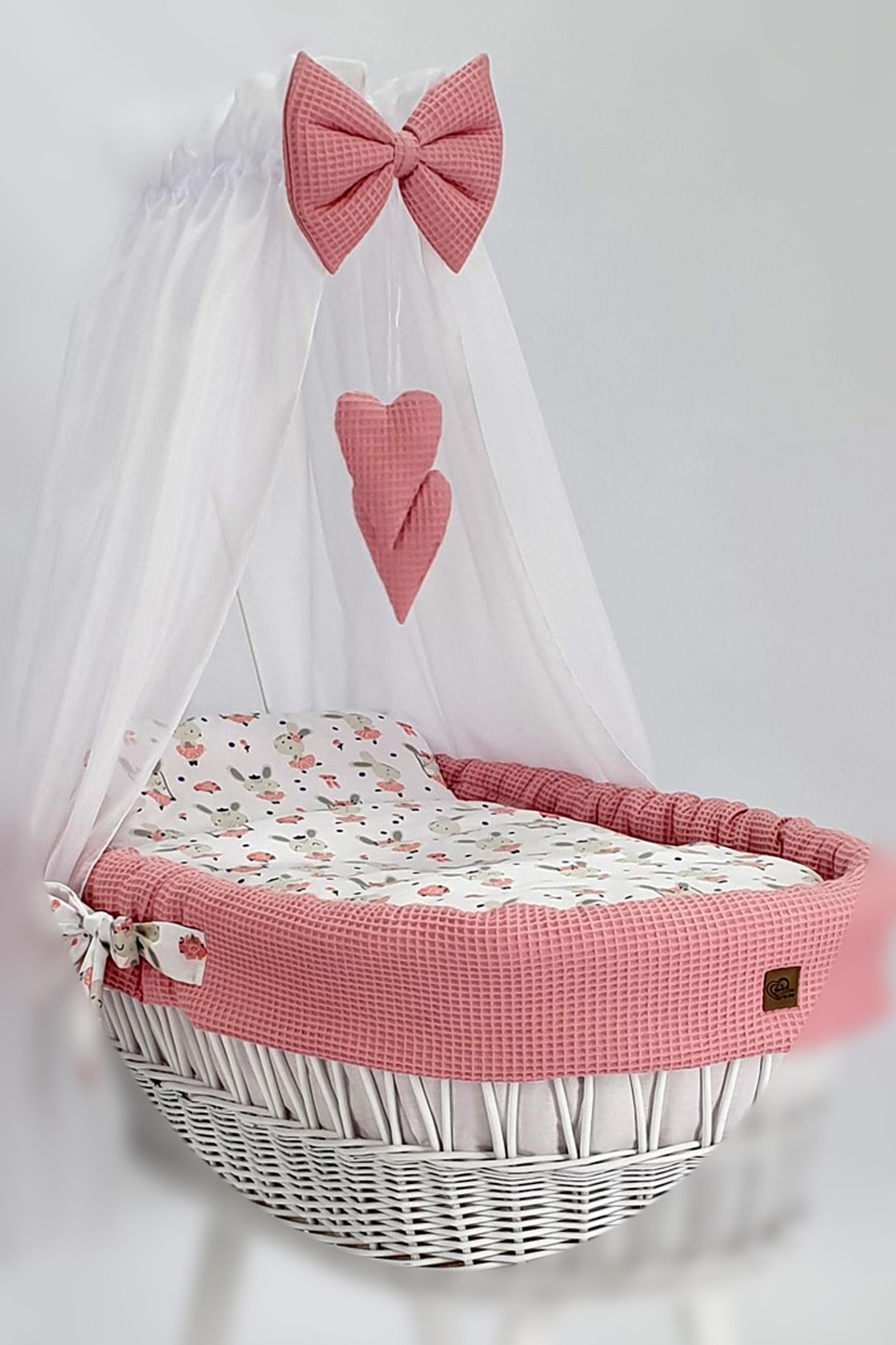 Commandez dès aujourd’hui cet habillage complet XL en coton gaufré pour berceau en osier - disponible en rose poudré - et transformez votre grand couffin bébé en un nid de douceur, de style et de sécurité.