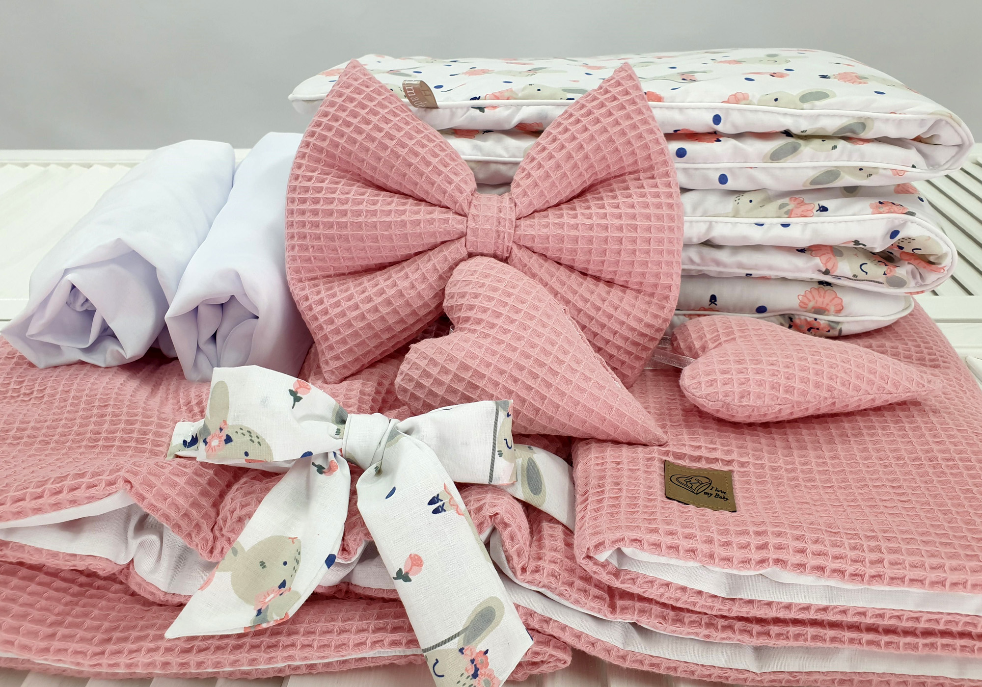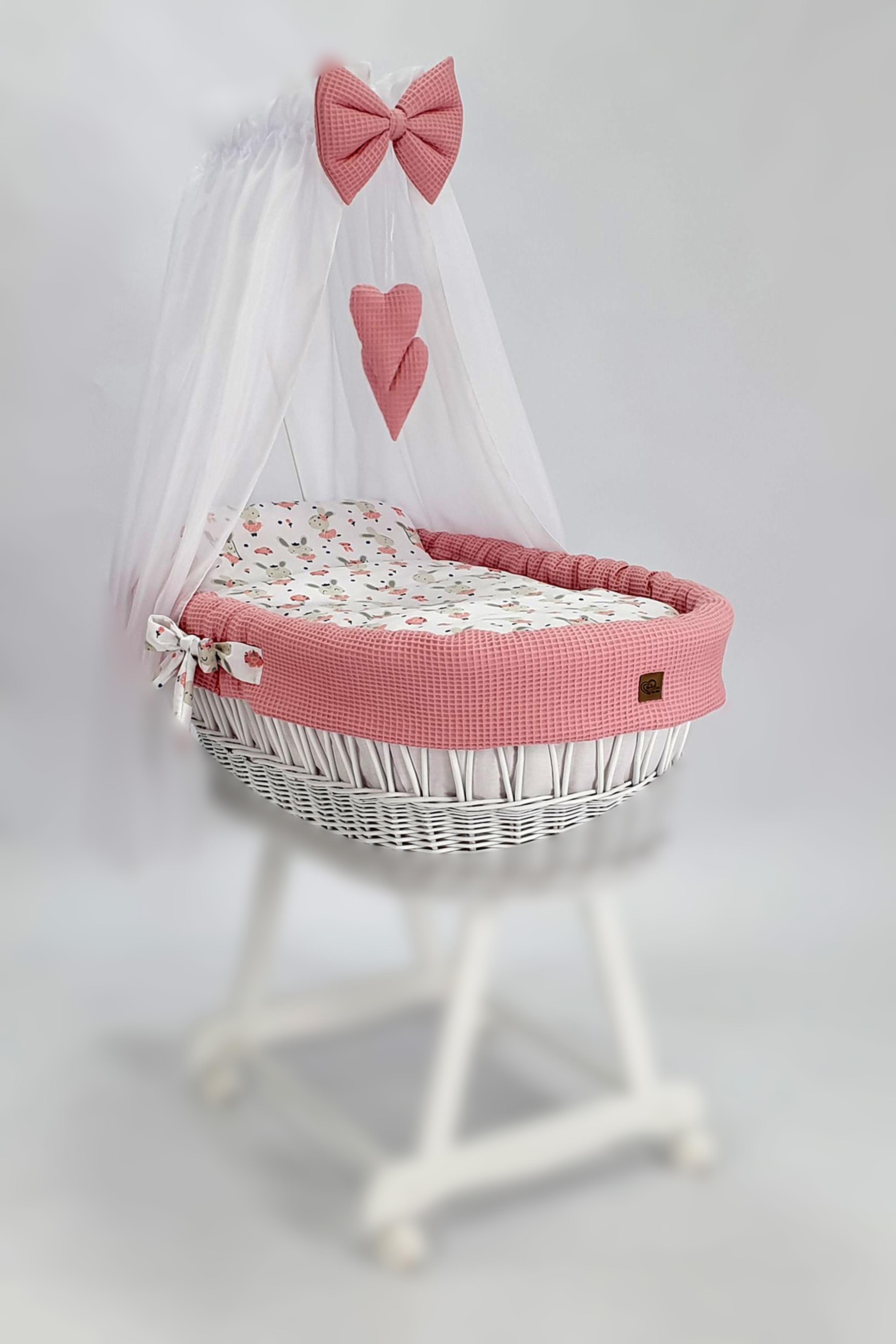 Habillage complet XXL pour tres grand berceau en osier - coton gaufré - rose poudré