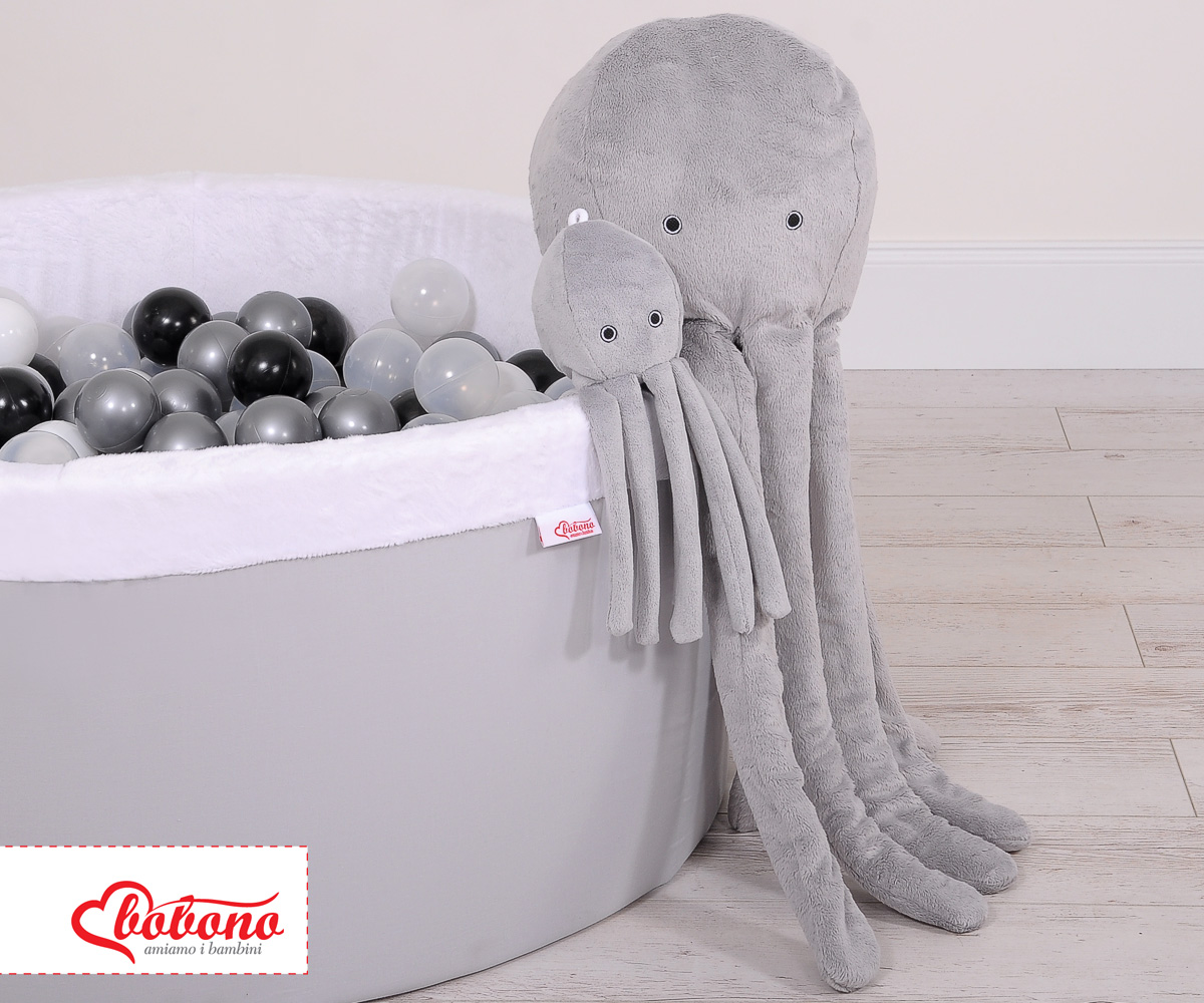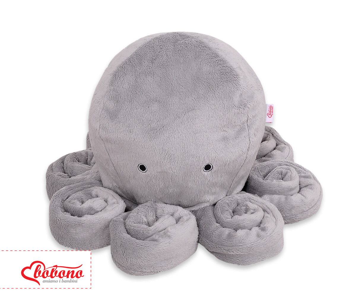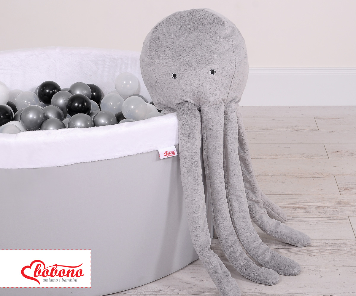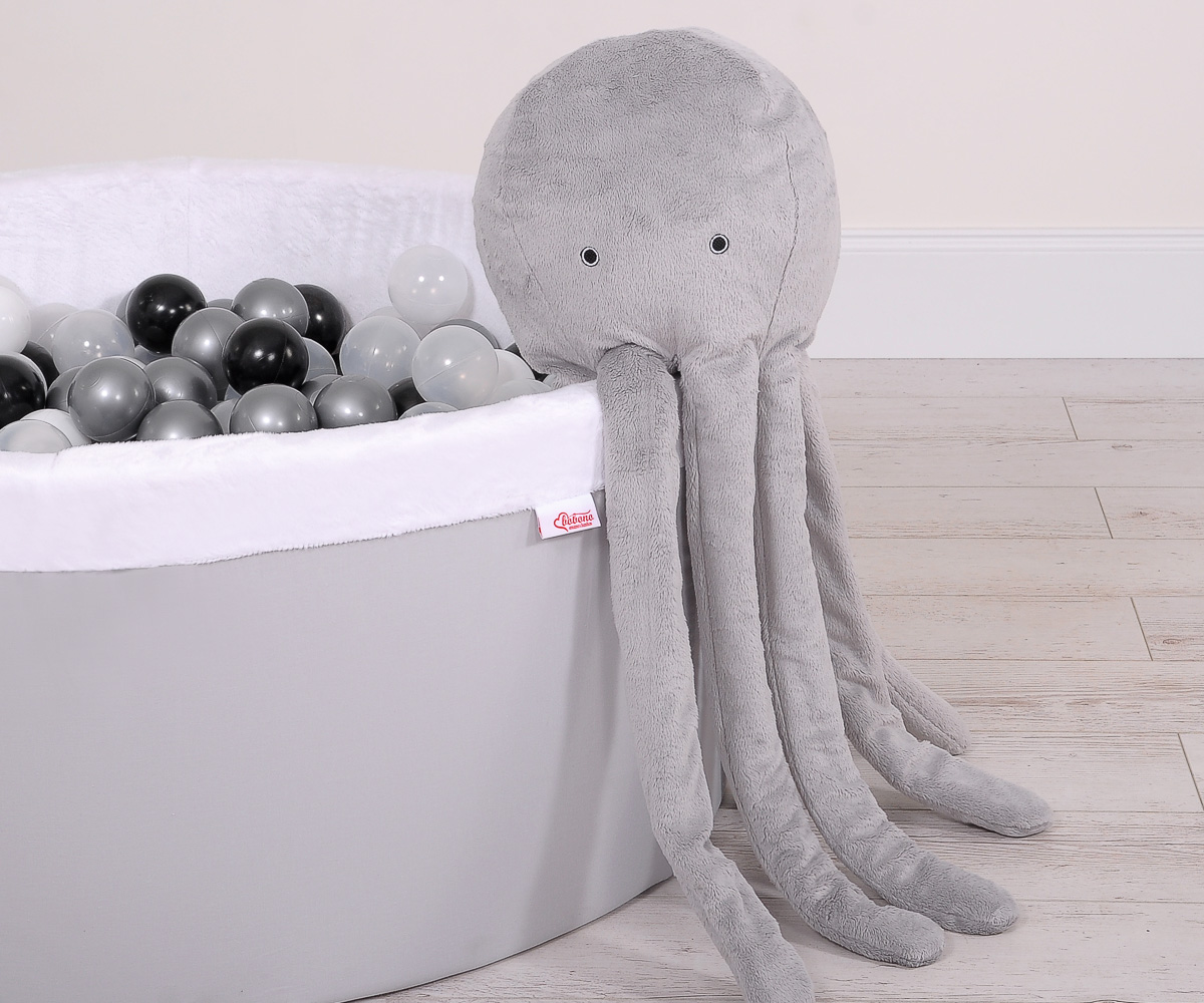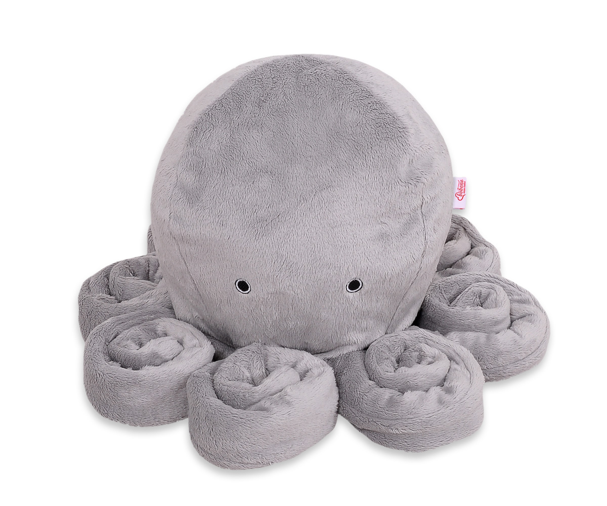 La drôle de pieuvre en peluche est parfaite pour dormir et faire des câlins pour chaque bébé. Les bras de l'ostopus sont confortables à tenir par les petites mains de bébé. La pieuvre est parfaite et sans danger pour les bébés dès les premiers moments de leur vie. Avec le doux bruit du hochet, elle attire l'attention de l'enfant sur elle-même. Elle est faite d'une toison de minky douce au toucher, moelleuse et délicate. Le rembourrage à l'intérieur de l'oreiller est constitué de billes de silicone testées par Eco Fillball - "peluche artificielle" pour oreillers - qui assurent une bonne assise du bébé et une bonne circulation de l'air.