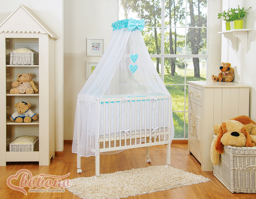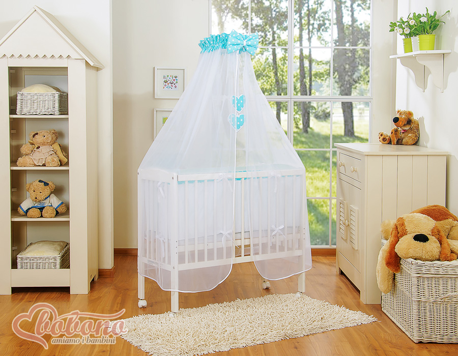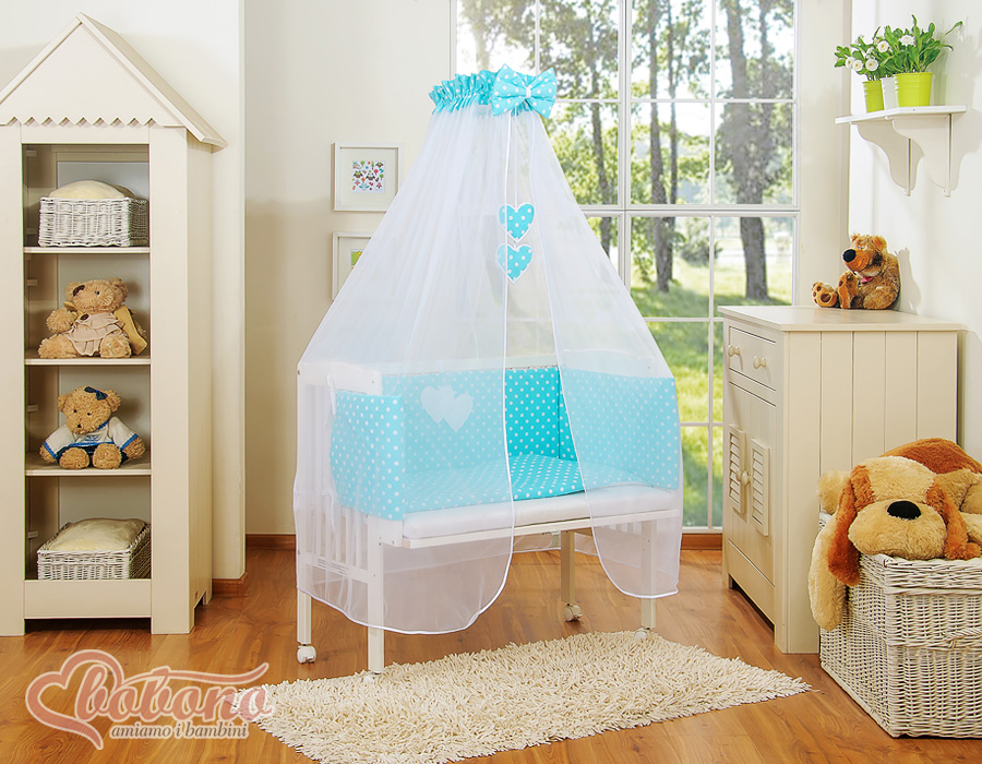 Bébé chambre » Lits bébé 120x60 cm » Lits de cododo » Lits de cododo » Lit Cododo avec Ciel Matelas et Linge Complet Turquoise à Pois Cœurs