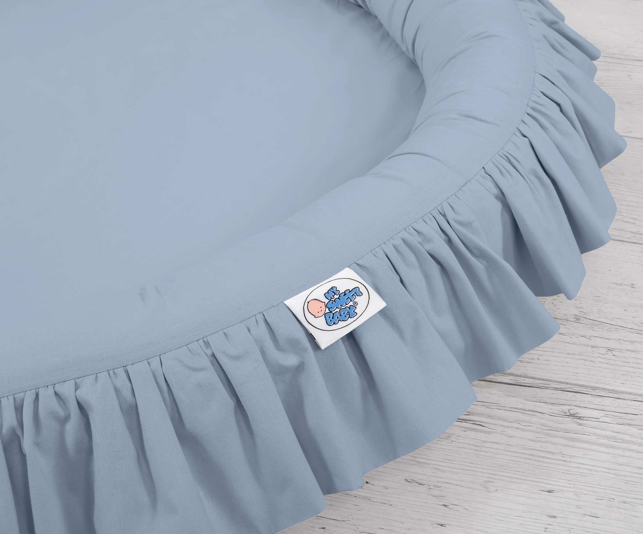 La housse est fabriquée en coton 100% certifié OKOTEX. Le bord est rempli d'un rembourrage approuvé et non allergène : Fibres Eco -Fillball. Elles sont douces, résistantes et assurent une bonne circulation de l'air. Le fond du nid à volants est fait d'un matériau moderne, antiallergique et attesté. La garniture du fond peut être enlevée et le couvercle lavable à 30 degrés.