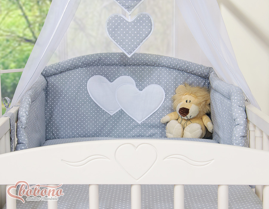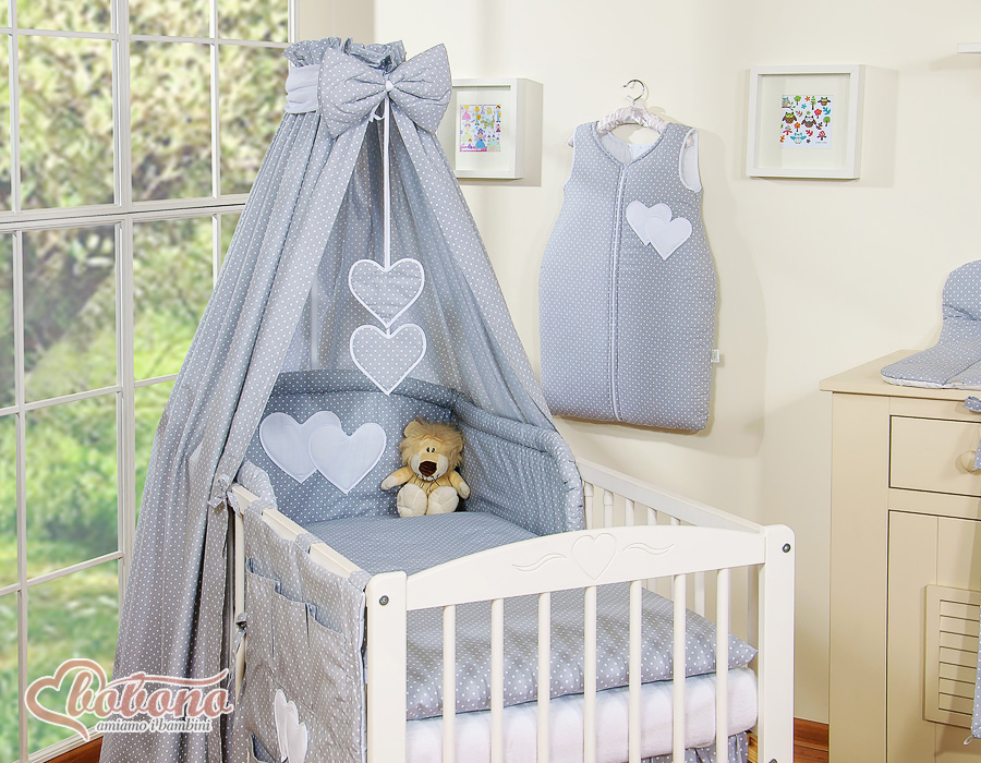 Bébé chambre » Linge de lit bébé » Linge de lit bébé Cœurs » Linge de lit bébé 140cm Cœurs » Ensemble de linge de lit 11 pcs avec ciel de lit » Parure de Linge Lit Bébé 11 pcs Ciel Gris à Pois Cœurs