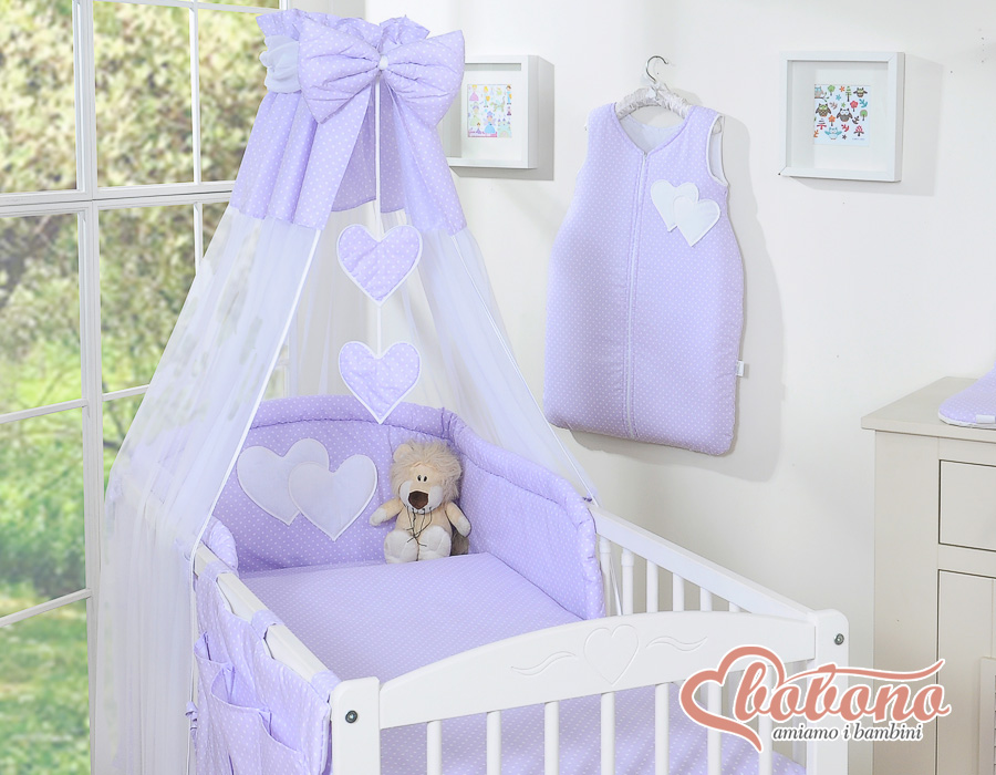 Bébé chambre » Linge de lit bébé » Linge de lit bébé Cœurs » Linge de lit bébé 120cm Cœurs » Ensemble de linge de lit 11 pcs avec ciel de lit » Parure de Linge Lit Bébé 11 pcs Ciel Lila à Pois Cœurs