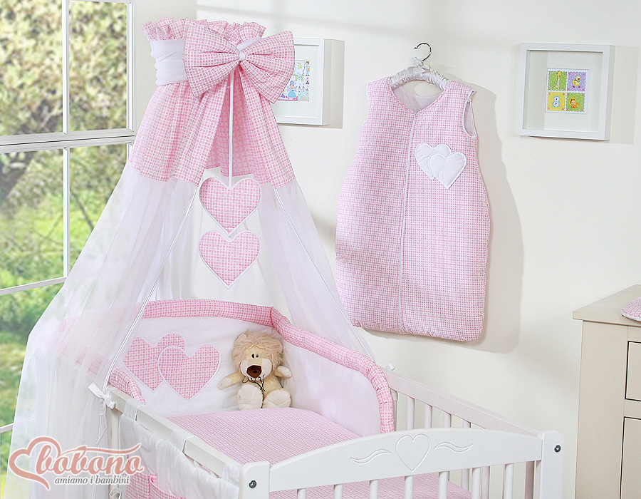 Bébé chambre » Linge de lit bébé » Linge de lit bébé Cœurs » Linge de lit bébé 140cm Cœurs » Ensemble de linge de lit 11 pcs avec ciel de lit » Parure de Linge Lit Bébé 11 pcs Ciel Rose à Carreaux Cœurs