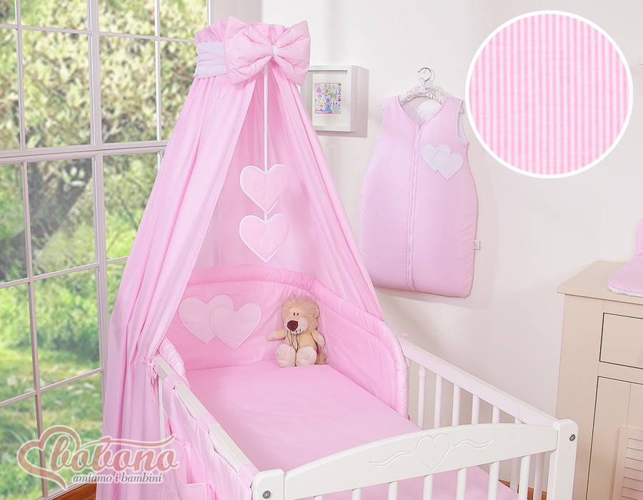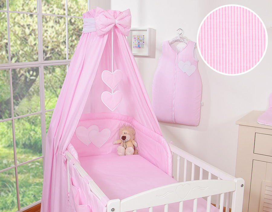 Bébé chambre » Linge de lit bébé » Linge de lit bébé Cœurs » Linge de lit bébé 120cm Cœurs » Ensemble de linge de lit 11 pcs avec ciel de lit » Parure de Linge Lit Bébé 11 pcs Ciel Rose Rayures Cœurs