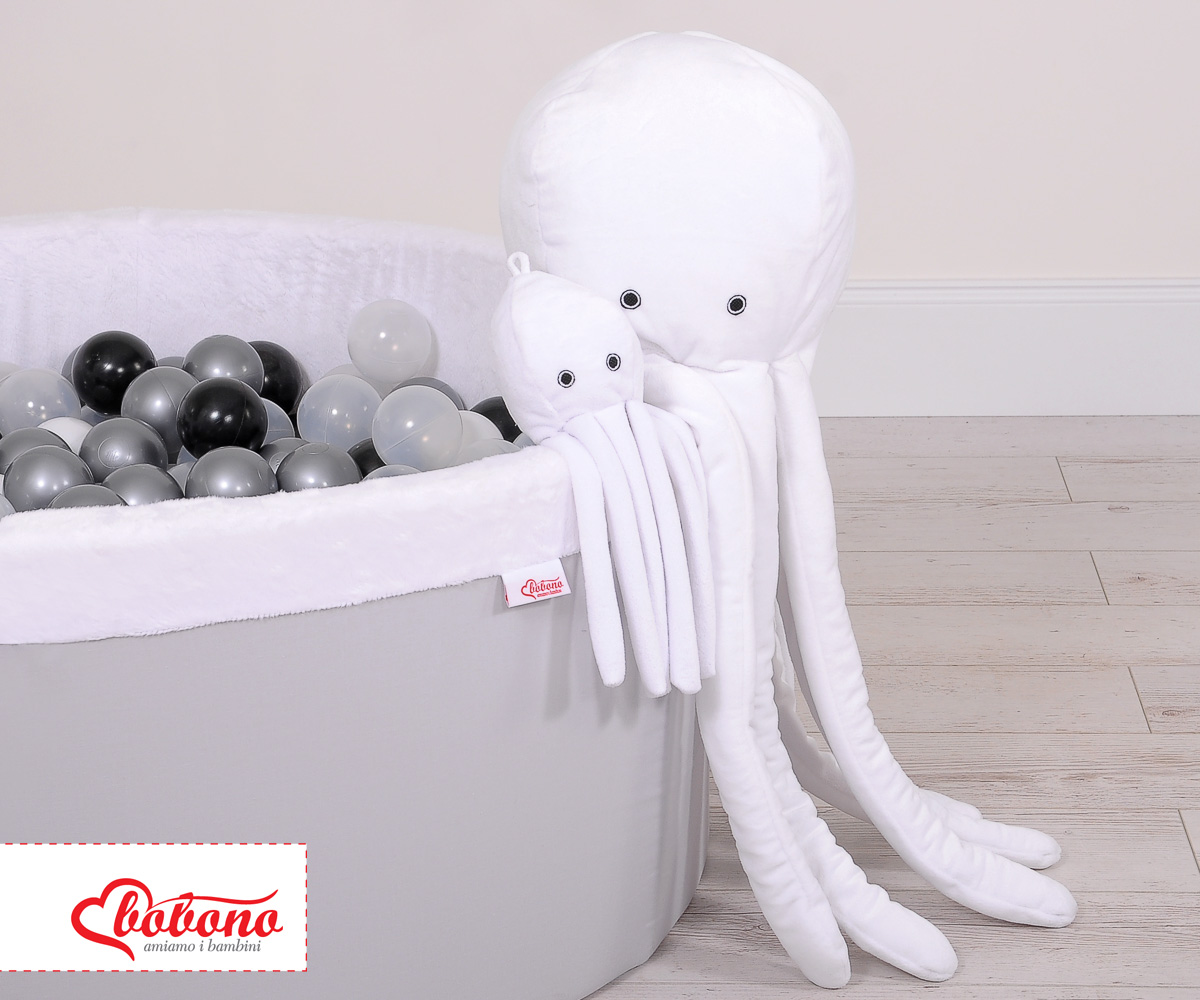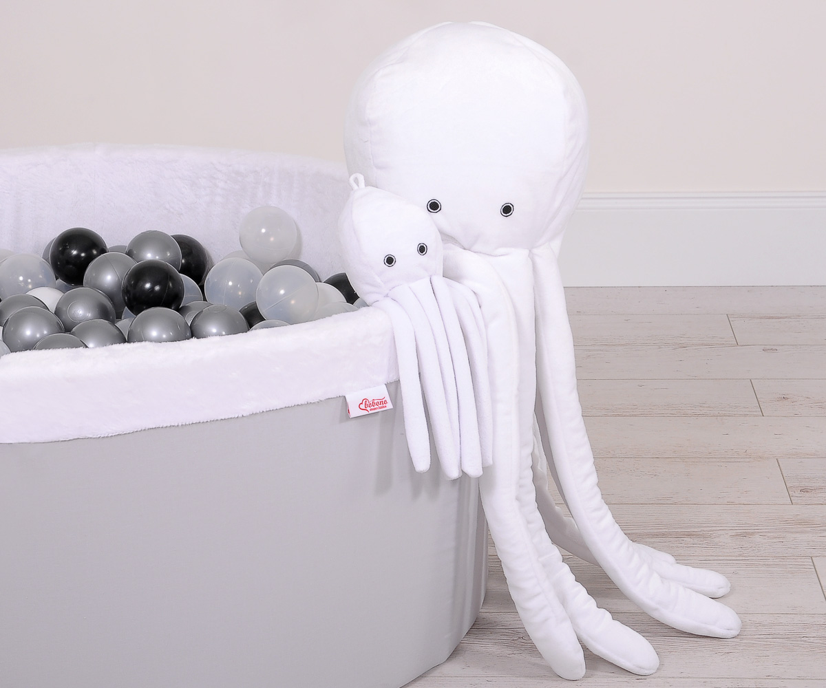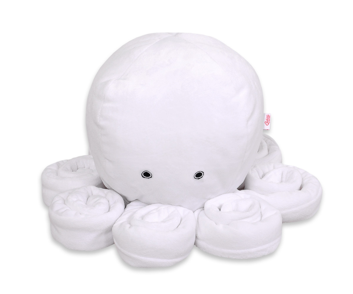 La drôle de pieuvre en peluche est parfaite pour dormir et faire des câlins pour chaque bébé. Les bras de l'ostopus sont confortables à tenir par les petites mains de bébé. La pieuvre est parfaite et sans danger pour les bébés dès les premiers moments de leur vie. Avec le doux bruit du hochet, elle attire l'attention de l'enfant sur elle-même. Elle est faite d'une toison de minky douce au toucher, moelleuse et délicate. Le rembourrage à l'intérieur de l'oreiller est constitué de billes de silicone testées par Eco Fillball - "peluche artificielle" pour oreillers - qui assurent une bonne assise du bébé et une bonne circulation de l'air.