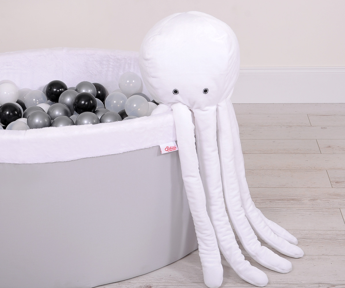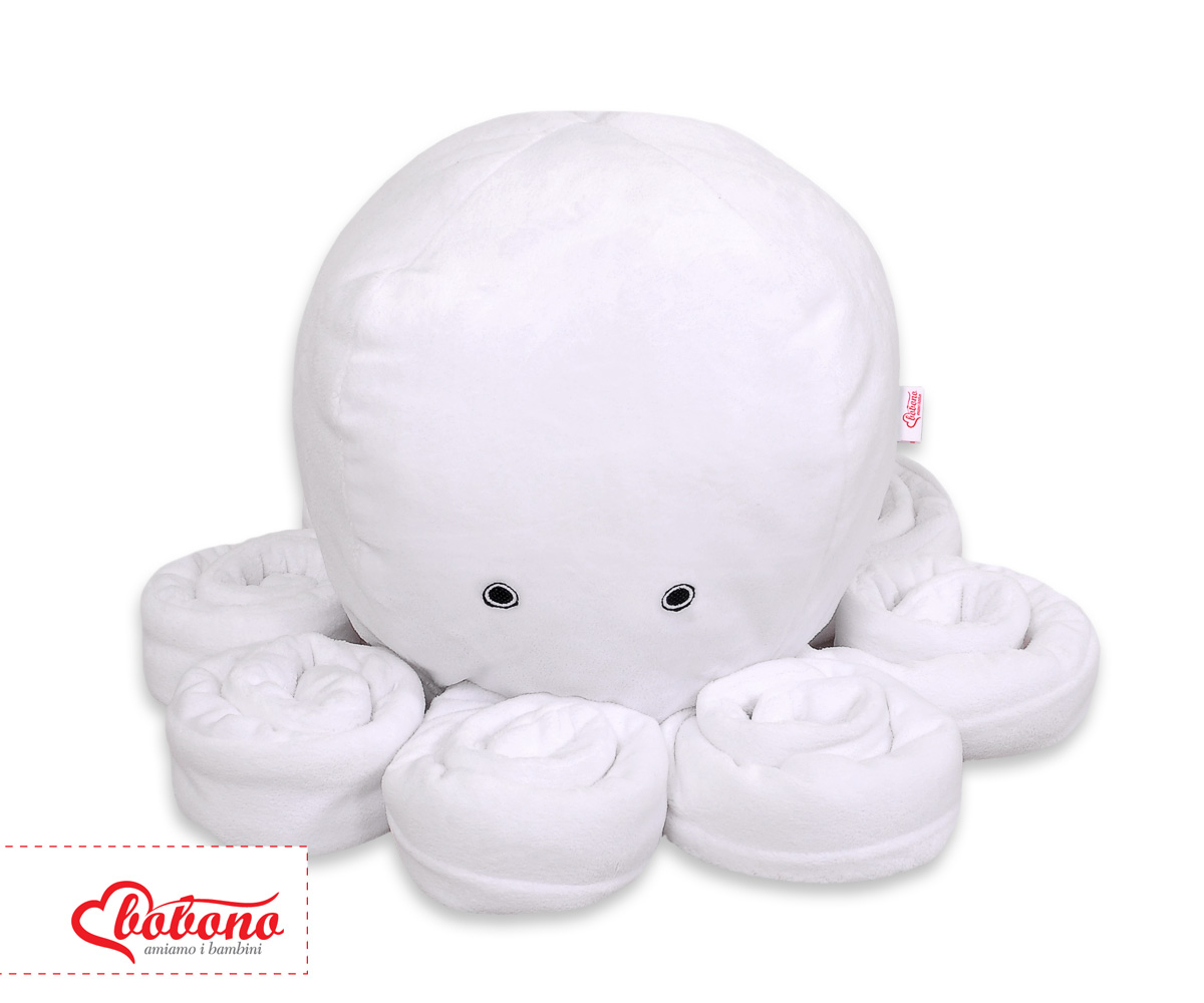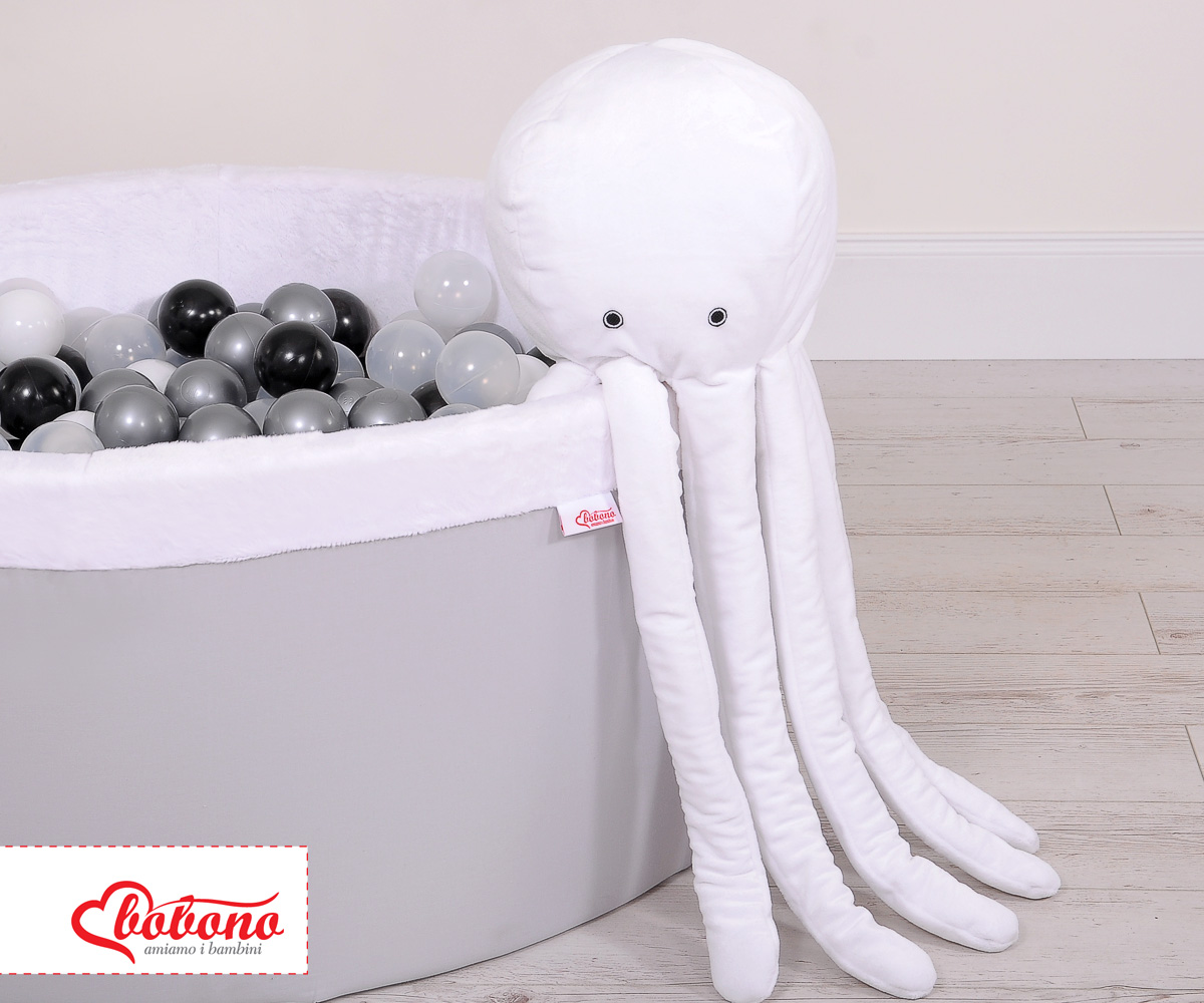 La drôle de pieuvre en peluche est parfaite pour dormir et faire des câlins pour chaque bébé. Les bras de l'ostopus sont confortables à tenir par les petites mains de bébé. La pieuvre est parfaite et sans danger pour les bébés dès les premiers moments de leur vie. Avec le doux bruit du hochet, elle attire l'attention de l'enfant sur elle-même. Elle est faite d'une toison de minky douce au toucher, moelleuse et délicate. Le rembourrage à l'intérieur de l'oreiller est constitué de billes de silicone testées par Eco Fillball - "peluche artificielle" pour oreillers - qui assurent une bonne assise du bébé et une bonne circulation de l'air.