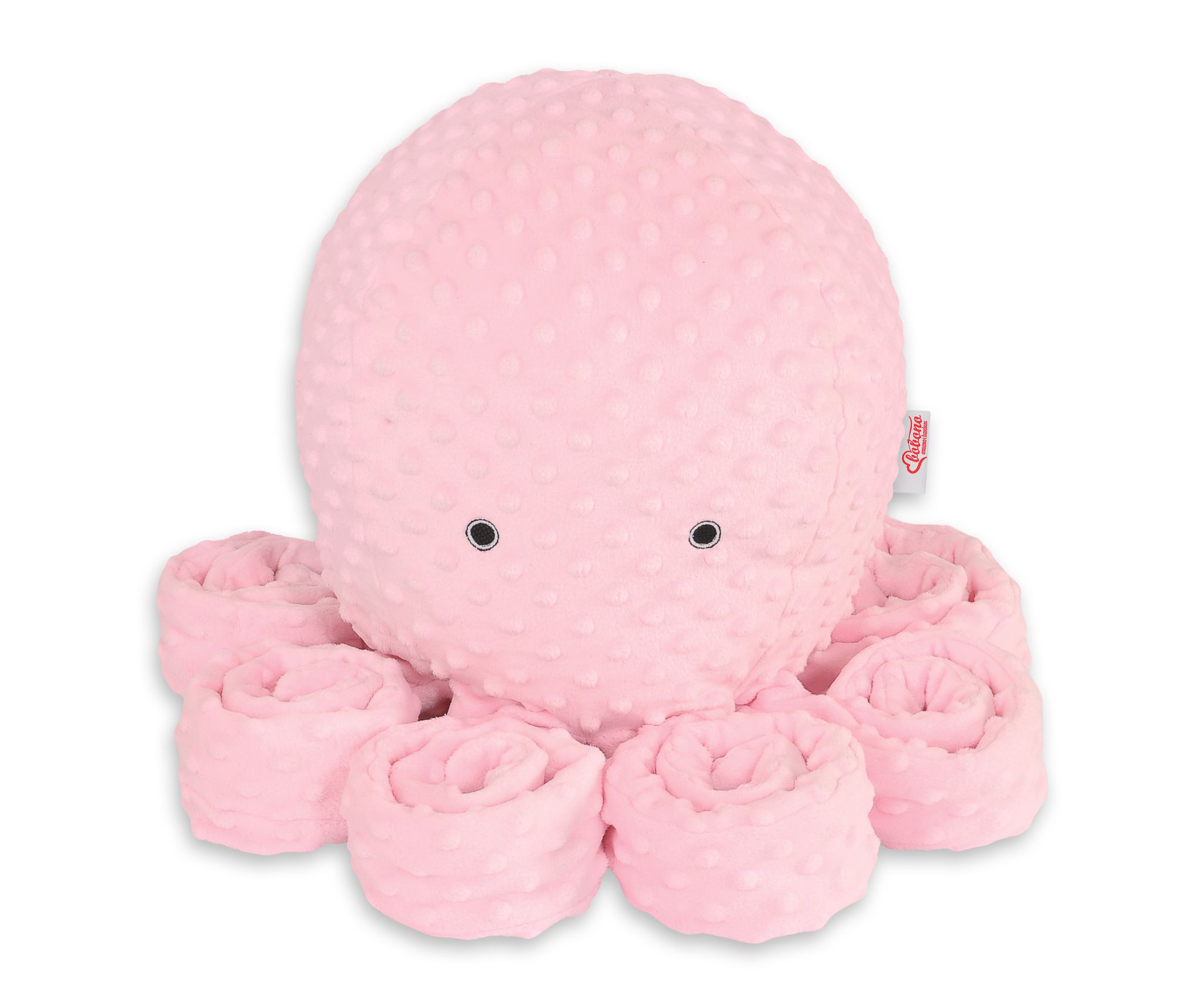 La drôle de pieuvre en peluche est parfaite pour dormir et faire des câlins pour chaque bébé. Les bras de l'ostopus sont confortables à tenir par les petites mains de bébé. La pieuvre est parfaite et sans danger pour les bébés dès les premiers moments de leur vie. Avec le doux bruit du hochet, elle attire l'attention de l'enfant sur elle-même. Elle est faite d'une toison de minky douce au toucher, moelleuse et délicate. Le rembourrage à l'intérieur de l'oreiller est constitué de billes de silicone testées par Eco Fillball - "peluche artificielle" pour oreillers - qui assurent une bonne assise du bébé et une bonne circulation de l'air.