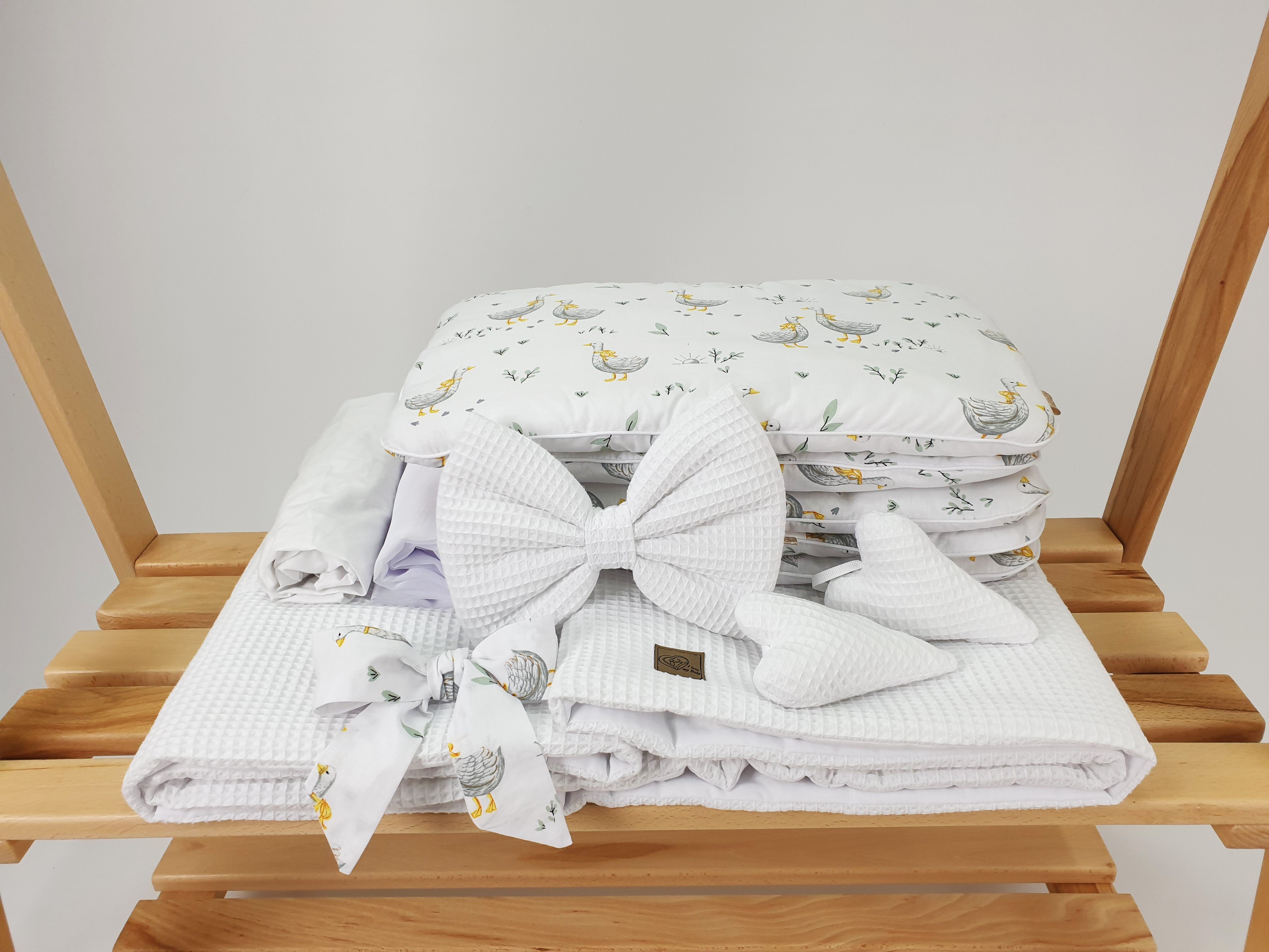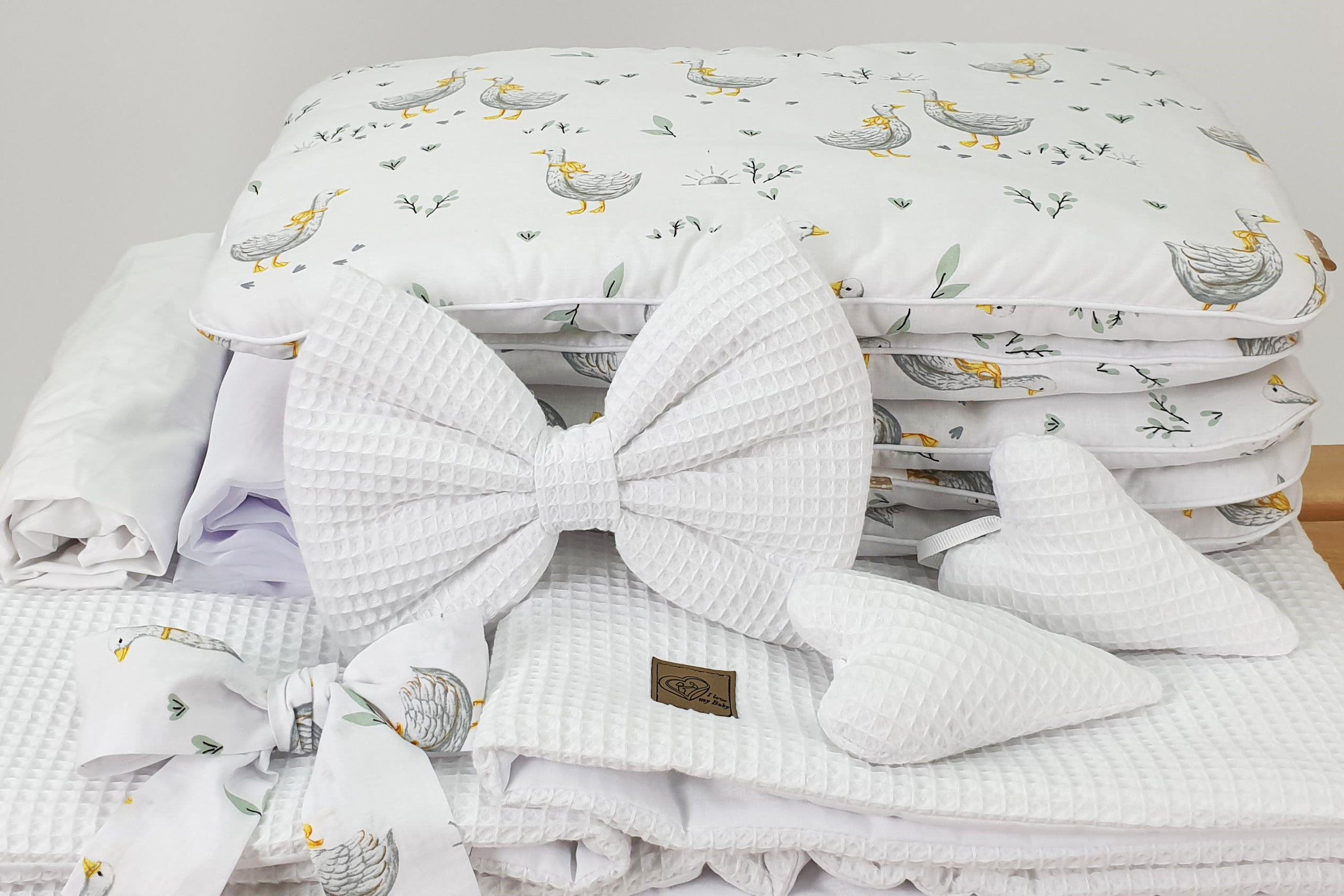 Offrez à votre bébé le plus grand confort avec ce set complet 5 pièces en taille XXL, conçu pour les très grands berceaux en osier. Grâce à son matériau en coton gaufré (nid d’abeille) de haute qualité, ce habillage combine élégance, douceur et fonctionnalité. La version XXL inclut un ouverture discrète pour l’anse de transport du panier - idéal pour les modèles haut de gamme.