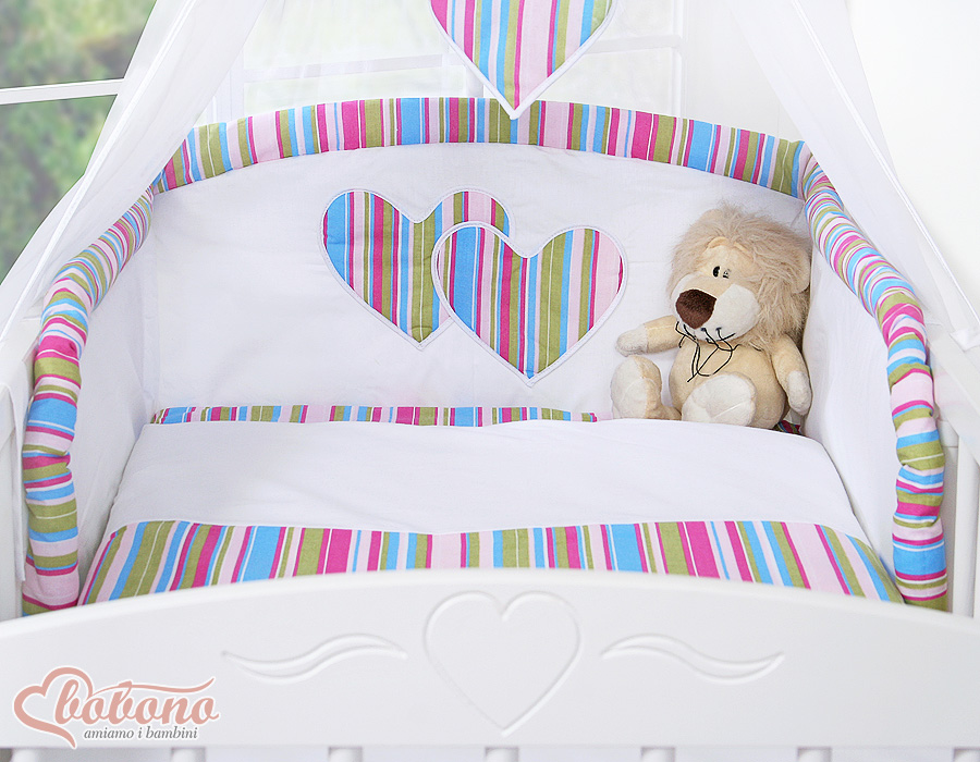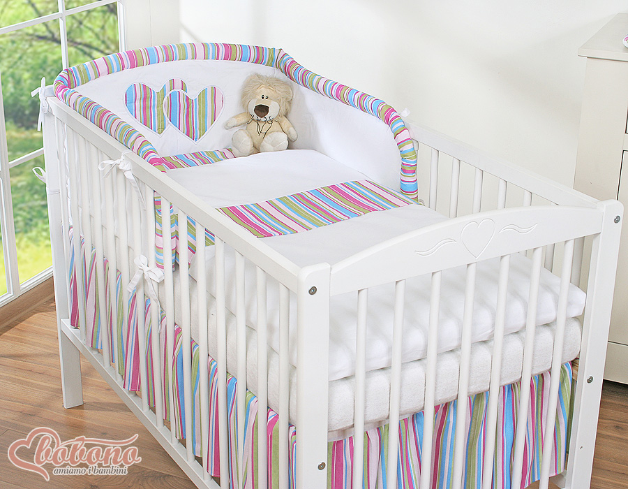 Dimensions : 188 cm de longueur, 35 cm de hauteur. Conçu spécialement avec des coutures supplémentaires. Il convient parfaitement aux lits pour bébé ou berceaux 60x120 cm et 70x140 cm. Tête de lit haute, légèrement arrondie avec des cœurs décoratifs, soigneusement orné avec du liseré de satin. Des rebords rembourrés, renforcés et épaissis spécialement pour plus de douceur et plus de sécurité dans le lit.