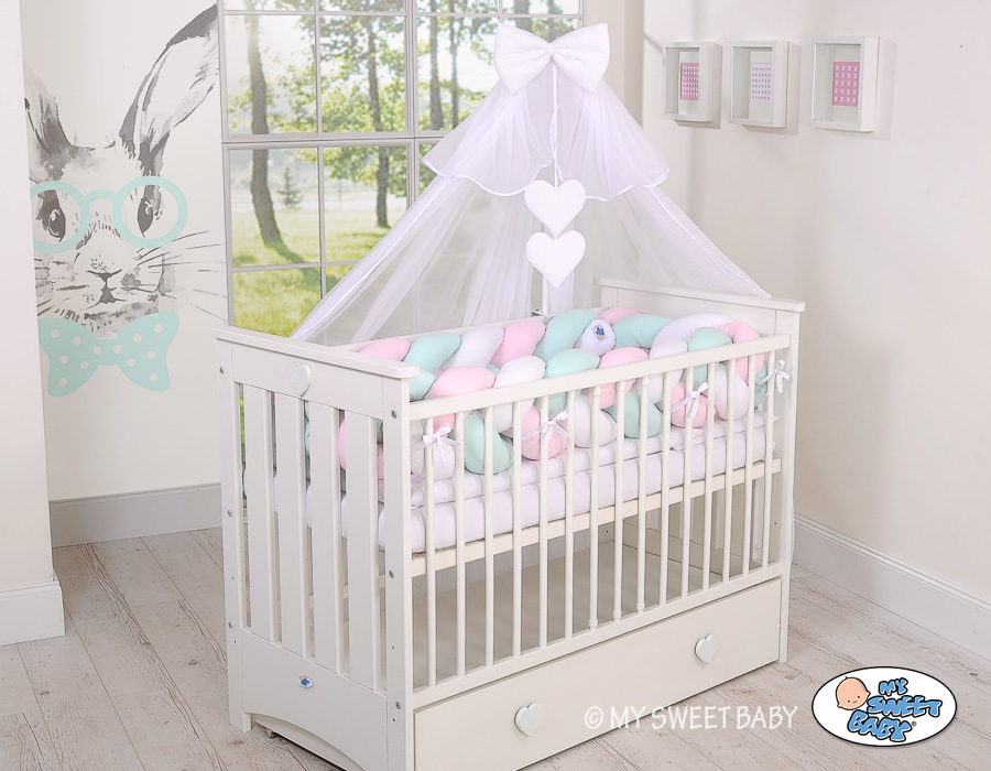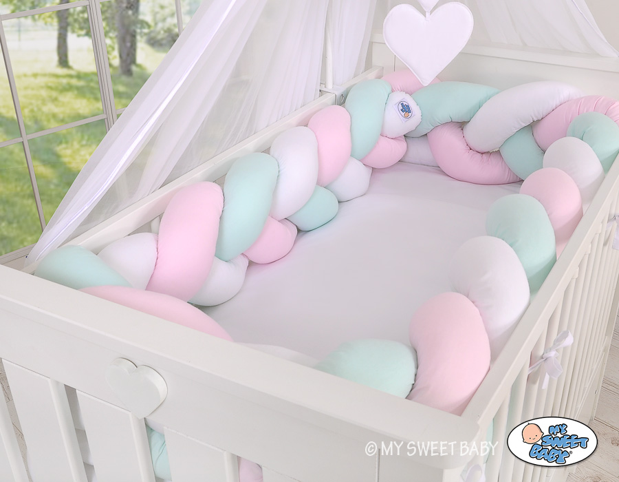 Tour de Lit Bébé Tressé Extra Long 3,6m Menthe Rose Blanc